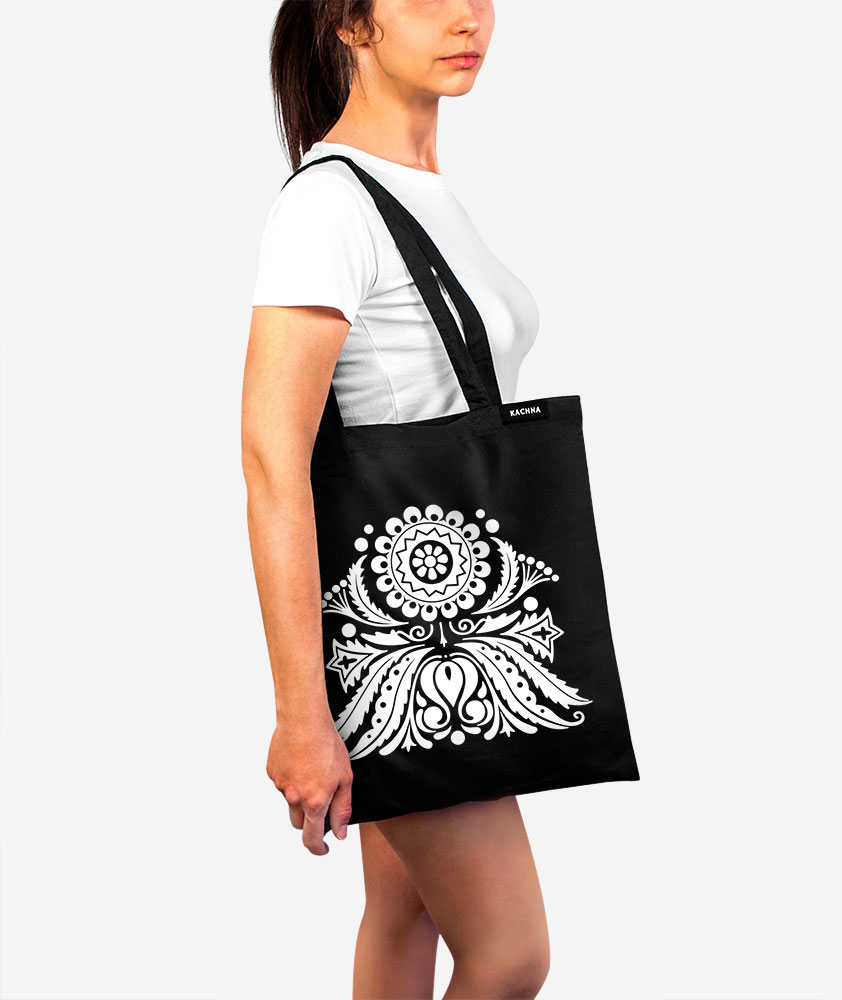 Bavlnená nákupná taška s folklórnym motívom florálnej tematiky v čistej bielej podobe na kontrastnej čiernej látke. Použitý ornament sa používal na celom západnom Slovensku. Základ použitej ornamentiky je totožný s ľudovým motívom Makovička, preto oba nájdeš v rovnakej kolekcii. Pozri aj ostatné vecičky z Makovej kolekcie.