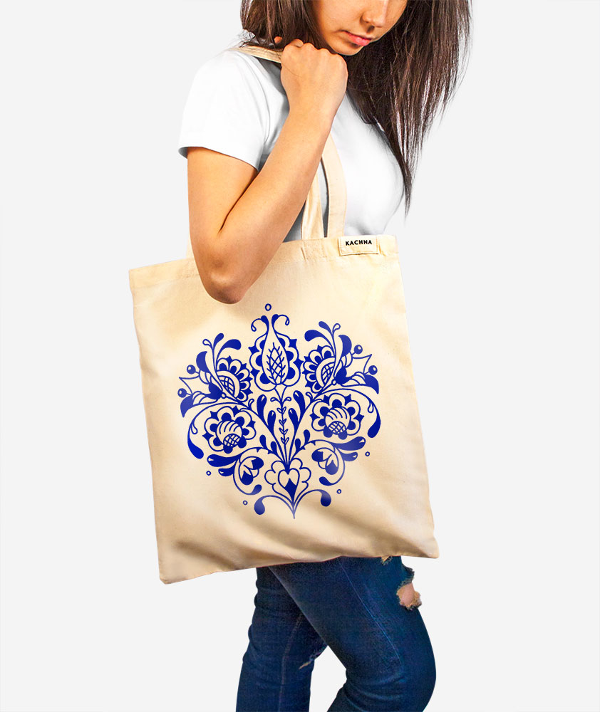 Bavlnená nákupná taška s folklórnym motívom zobrazujúcim pôvodne ručne kreslený kvet tulipánu pochádzajúcim v regióne Tekov, známom taktiež ako Dolné Pohronie na pohraničí západného a stredného Slovenska. Jednoduchá florálna ornamentika v čistej tmavomodrej podobe na prírodnom bavlnenom podklade. Pozri aj ostatné vecičky z Tekovskej kolekcie.