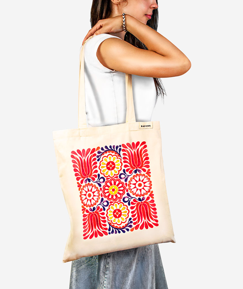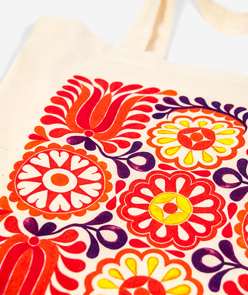 Bavlnená nákupná taška s pestrofarebným folklórnym motívom zobrazujúcim tradičný trnavský ornament, ktorý upúta svojou sviežou letnou farebnosťou. Pôvodná maľba vznikala ručnou prácou s akvarelom, ktorý vďaka svojmu rýchlemu schnutiu, zanecháva charakteristickú textúru viditeľných ťahov štetcom. Pozri aj ostatné vecičky z Trnavskej kolekcie.