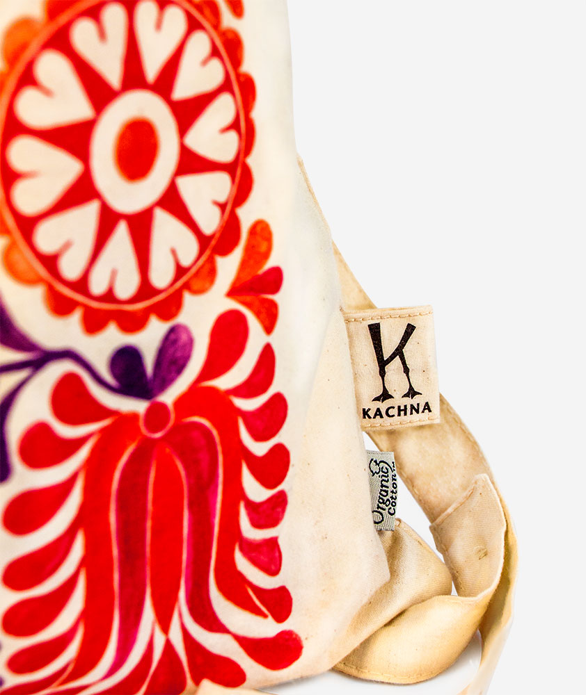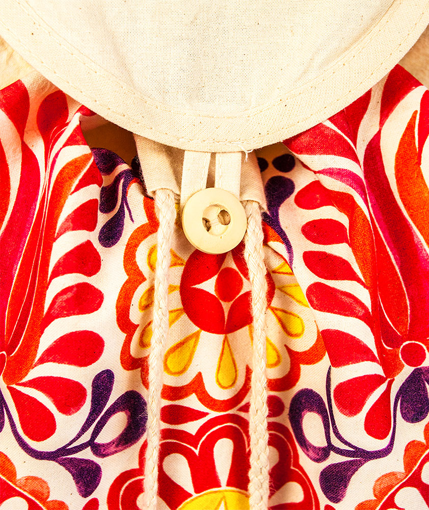 Látkový batôžtek s pestrofarebným folklórnym motívom zobrazujúcim tradičný trnavský ornament, ktorý upúta svojou sviežou letnou farebnosťou. Pôvodná maľba vznikala ručnou prácou s akvarelom, ktorý vďaka svojmu rýchlemu schnutiu, zanecháva charakteristickú textúru viditeľných ťahov štetcom. Pozri aj ostatné vecičky z Trnavskej kolekcie.
