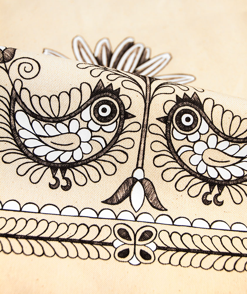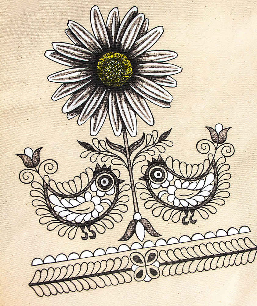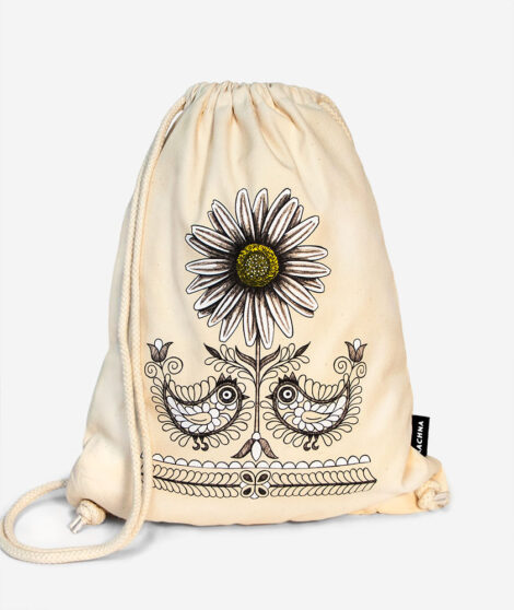 Na prírodný sťahovací batoh s folklórnym motívom Margarétka sme použili tradičnú ľudovú ornamentiku s pôvodom z obcí Čataj a Veľký Grob. Pôvodne ručne kreslený tradičný ľudový ornament s jemnými vzormi a poľnými vtákmi, sme doplnili ústredným kvetom veľkej margarétky. Praktické sťahovacie batohy zo 100% bio bavlny posielame v darčekových ručne maľovaných krabičkách.