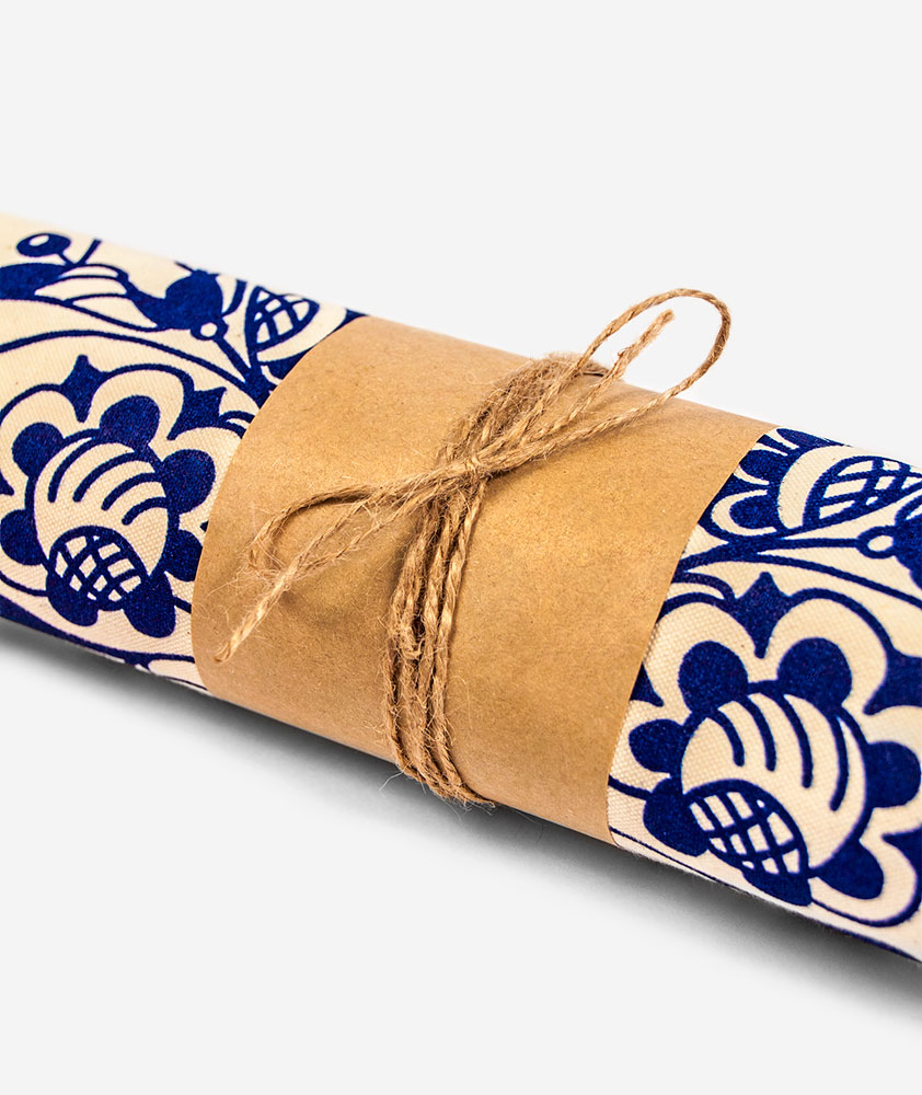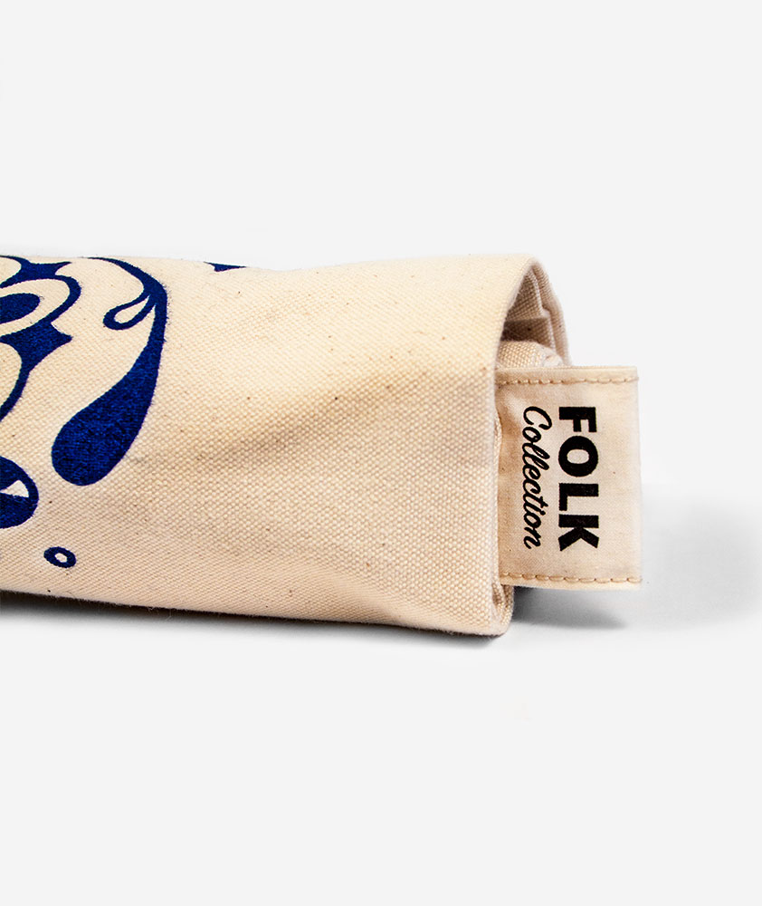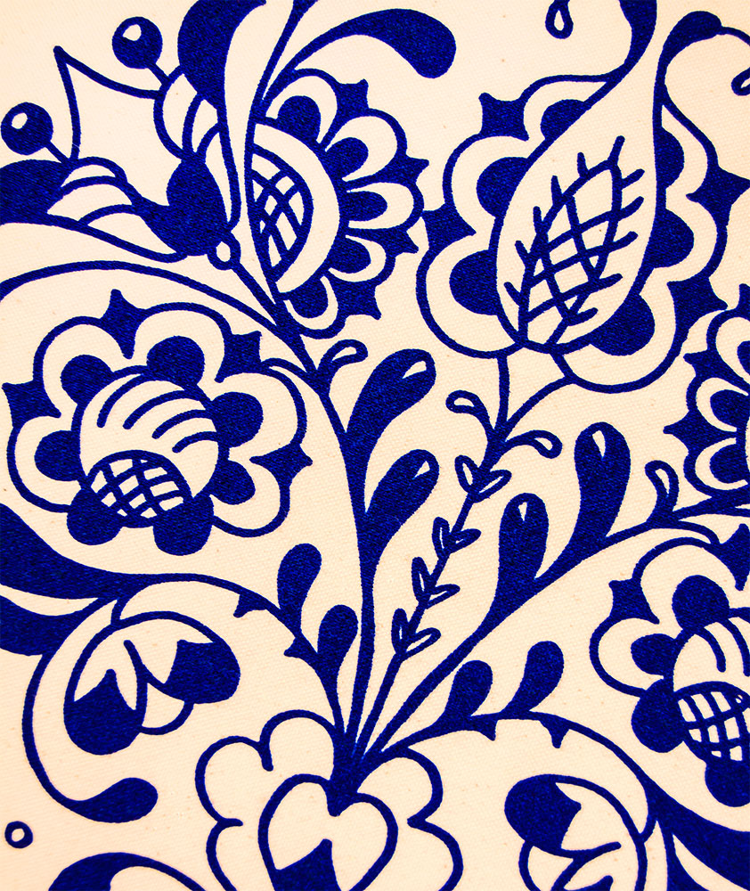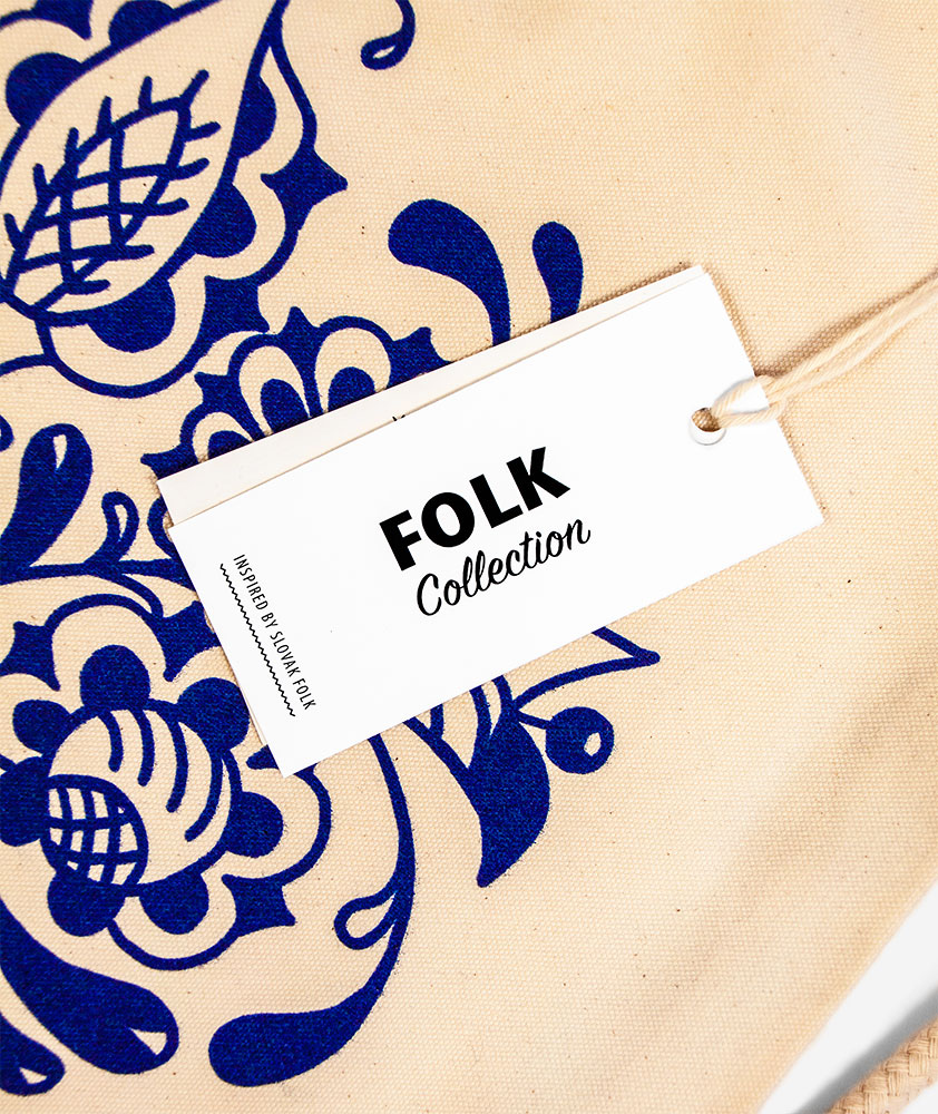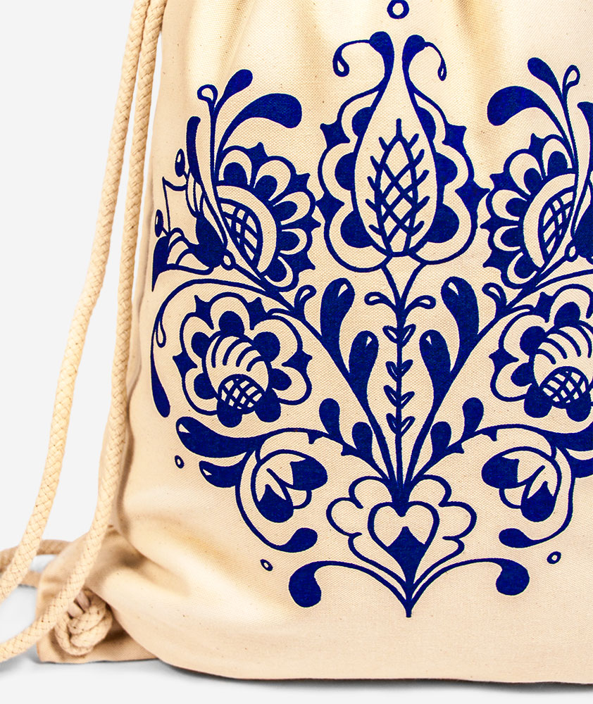 Bavlnený vak s folklórnym motívom zobrazujúcim pôvodne ručne kreslený kvet tulipánu pochádzajúcim v regióne Tekov, známom taktiež ako Dolné Pohronie na pohraničí západného a stredného Slovenska. Jednoduchá florálna ornamentika v čistej tmavomodrej podobe na béžovom podklade. Pozri aj ostatné vecičky z Tekovskej kolekcie.