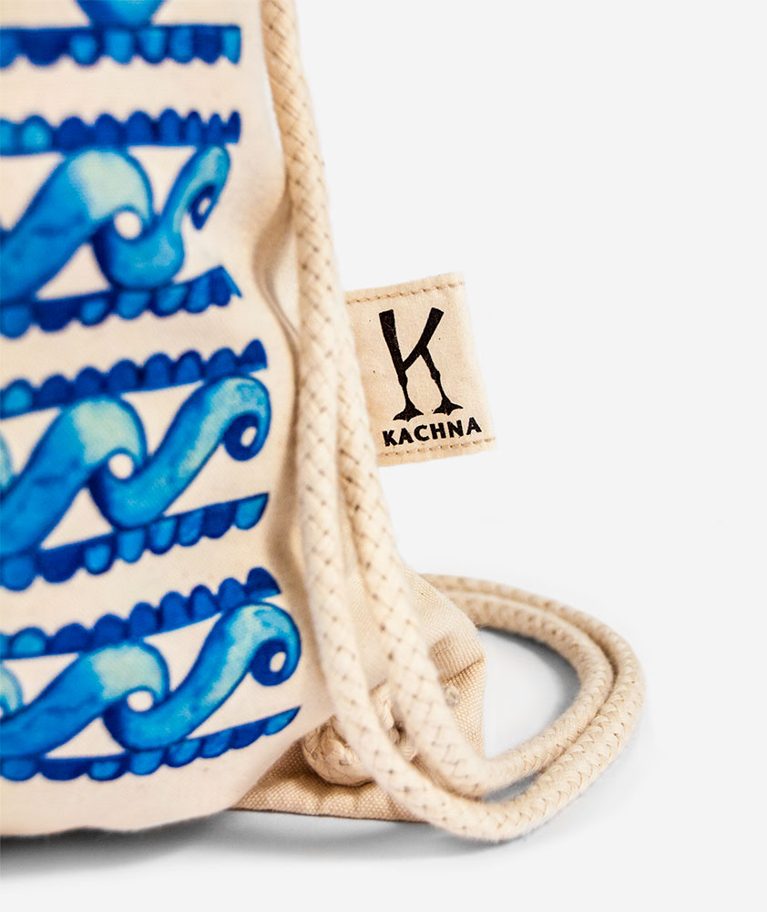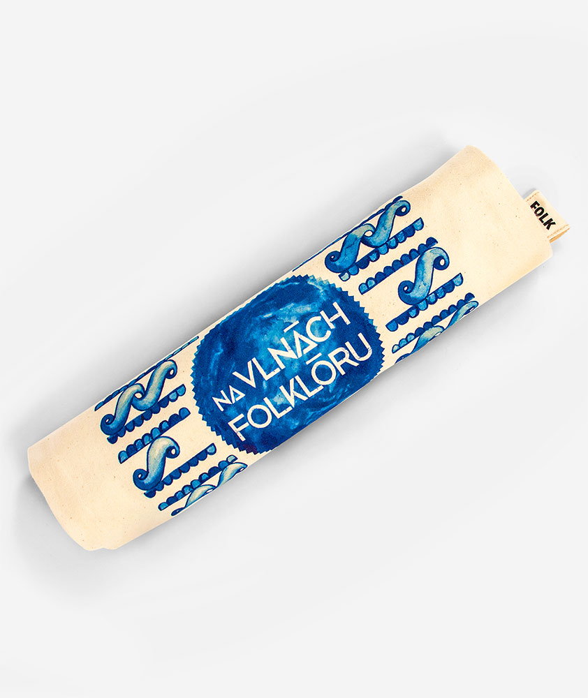 Bavlnený vak s folklórnym motívom upúta žiarivými modrými odtieňmi. Motív vznikol ručnou prácou, maľovaním akvarelovými farbami. Jeho vzhľad pripomína súčasné moderné minimalistické zobrazenia morských vĺn, v skutočnosti sa však jedná o náš slovenský tradičný ľudový ornament z detvianskeho regiónu.