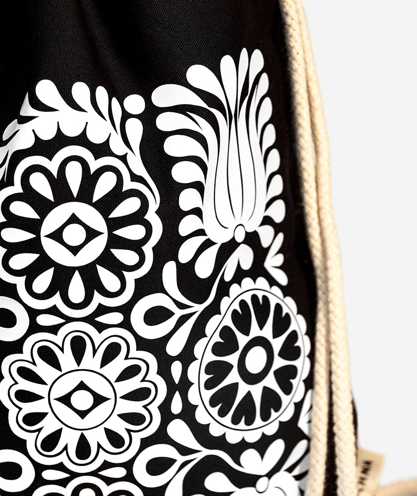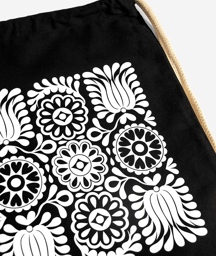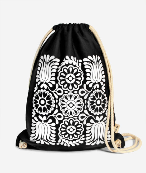 Na čierny sťahovací batoh s folklórnym motívom Trnava sme použili tradičnú ľudovú ornamentiku s pôvodom z mesta Trnavy a jej okolia. Jedná sa o štylizované zobrazenie záhonu tulipánov a ďalších kvetov. Trnavské florálne vzory prinášame na tričkách i vakoch v rôznych farebných prevedeniach. Praktické sťahovacie batohy zo 100% bio bavlny posielame v darčekových ručne maľovaných krabičkách.