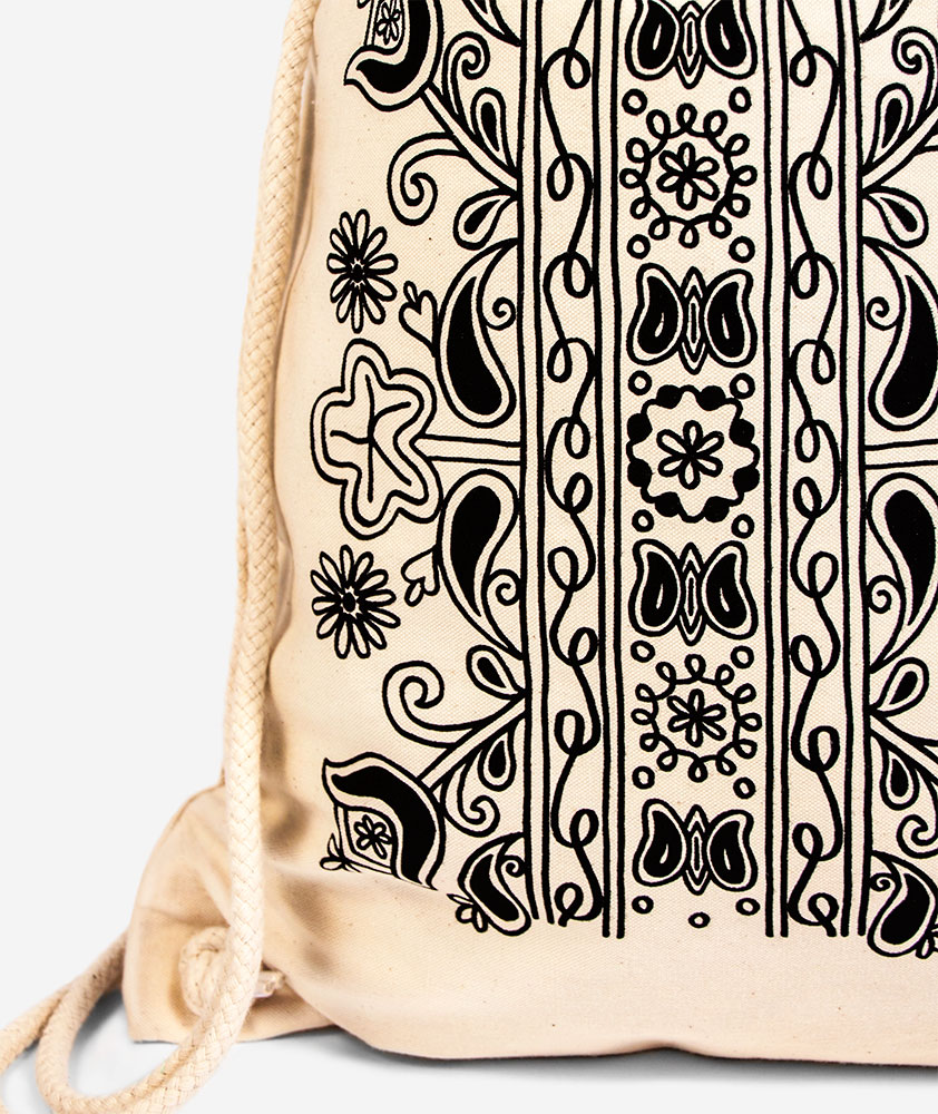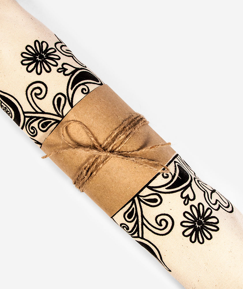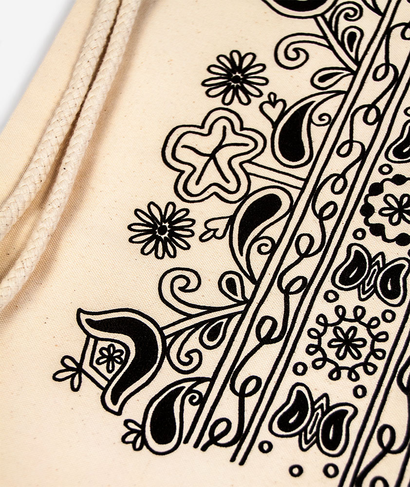 Bavlnený vak s folklórnym motívom zobrazujúcim tradičný ľudový ornament s lúčnou flórou a motýľmi. Použitím sýtej čiernej farebnosti ľudový vzor výrazne kontrastuje so svetlým podkladom z organickej bavlny. Jednoduchá, pôvodne ručne kreslená ornamentika, má pôvod na strednom Slovensku, konkrétne v jednom z našich najstarších miest – v meste Zvolen. Pozri aj ostatné vecičky zo Zvolenskej kolekcie.