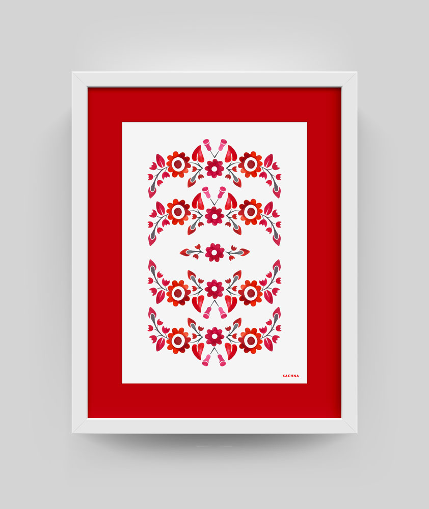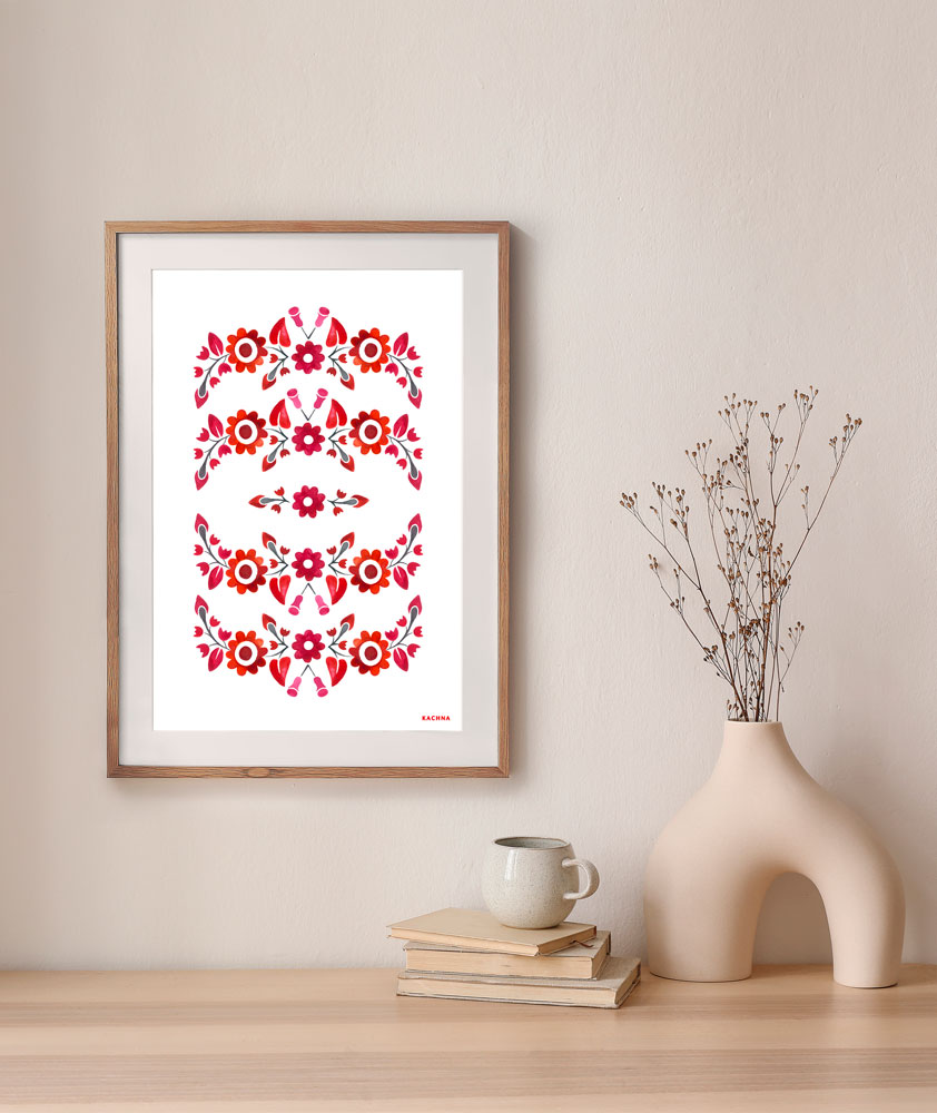 Umelecký print s folklórnym motívom Trenčianske kvietky, ktorý má svoj pôvod v obci Trenčianske Stankovce, neďaleko Trenčína. Jedná sa o moderné prevedenie pôvodnej florálnej výšivky miestneho ľudového kroja. Grafika je reprodukciou pôvodne ručne maľovanej ornamentiky akvarelovými farbami. Ľudové vzory z regiónu Trenčín prinášame na viacerých výrobkoch v rôznych farebných prevedeniach. Posielame v darčekových krabičkách.