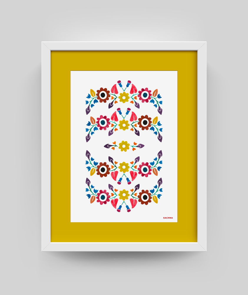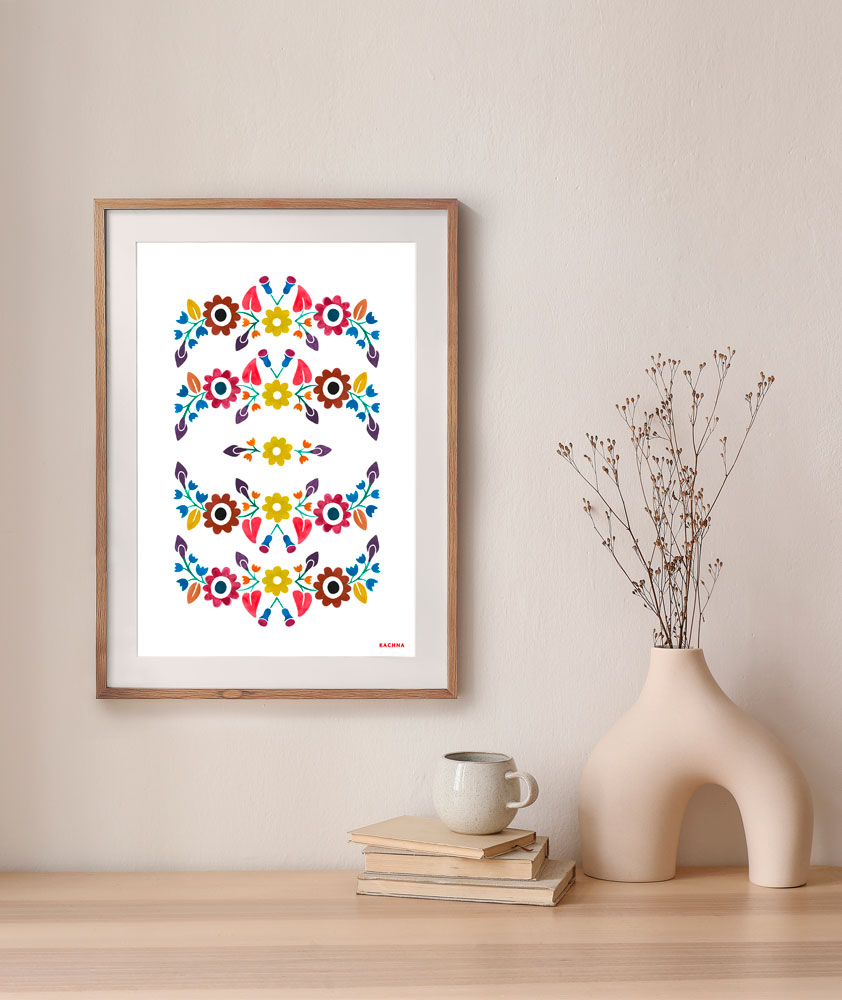 Umelecký print s folklórnym motívom Trenčianske kvietky, ktorý má svoj pôvod v obci Trenčianske Stankovce, neďaleko Trenčína. Jedná sa o moderné prevedenie pôvodnej florálnej výšivky miestneho ľudového kroja. Grafika je reprodukciou pôvodne ručne maľovanej ornamentiky akvarelovými farbami. Ľudové vzory z regiónu Trenčín prinášame na viacerých výrobkoch v rôznych farebných prevedeniach. Posielame v darčekových krabičkách.