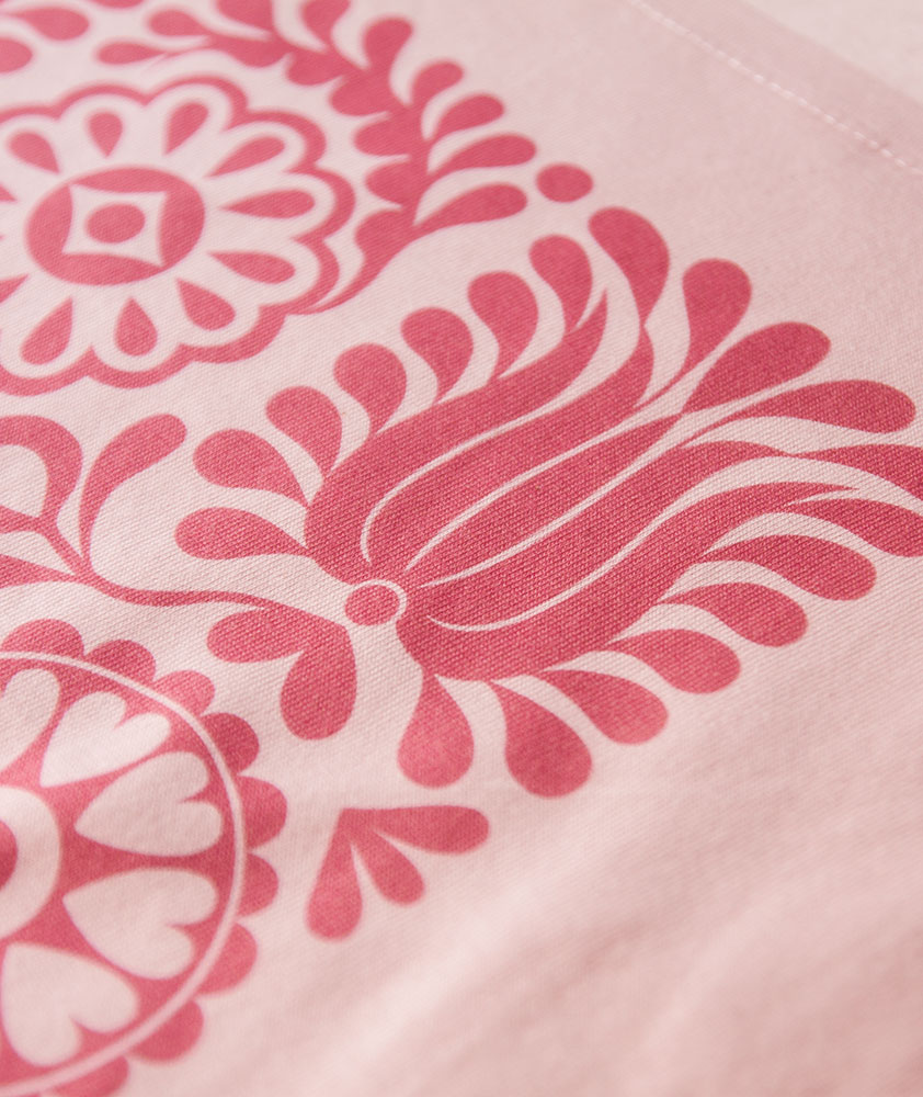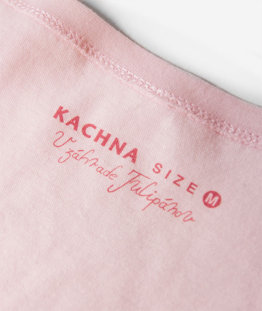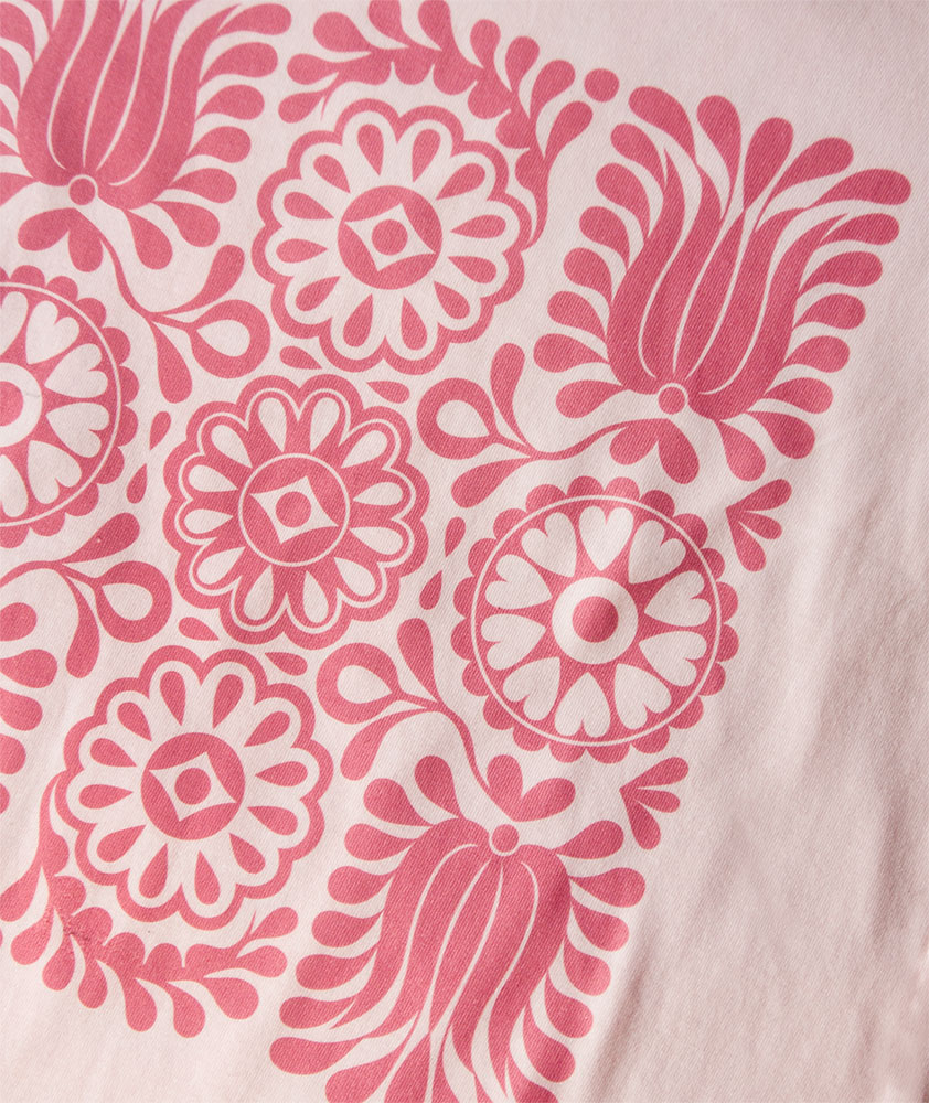 LIMITOVANÁ EDÍCIA. Dámske bavlnené tričko v jemnej ružovej farbe s ružovým folklórnym motívom zobrazujúcim tradičný trnavský ornament. Florálna ornamentika je štylizovaným zobrazením záhonu tulipánov a ďalších kvetov. Jemné ľahučké tričko s väčším výstrihom, ideálne na teplé letné dni. Pozri aj ostatné vecičky z Trnavskej kolekcie.