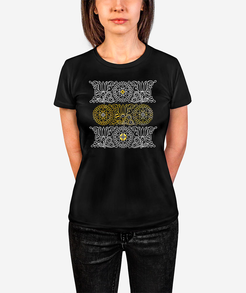 Čierne dámske tričko Flos Aureus – Zlatý Kvet s moderným poňatím tradičného folklórneho vzoru pochádzajúceho z oblasti Trnavy vychádza ako súčasť našej luxusnej kolekcie Gold & White, ktorá je kombináciou zlato-bieleho vzoru na čisto čiernom podklade. Tričká zo 100% bavlny posielame v darčekových ručne maľovaných krabičkách.
