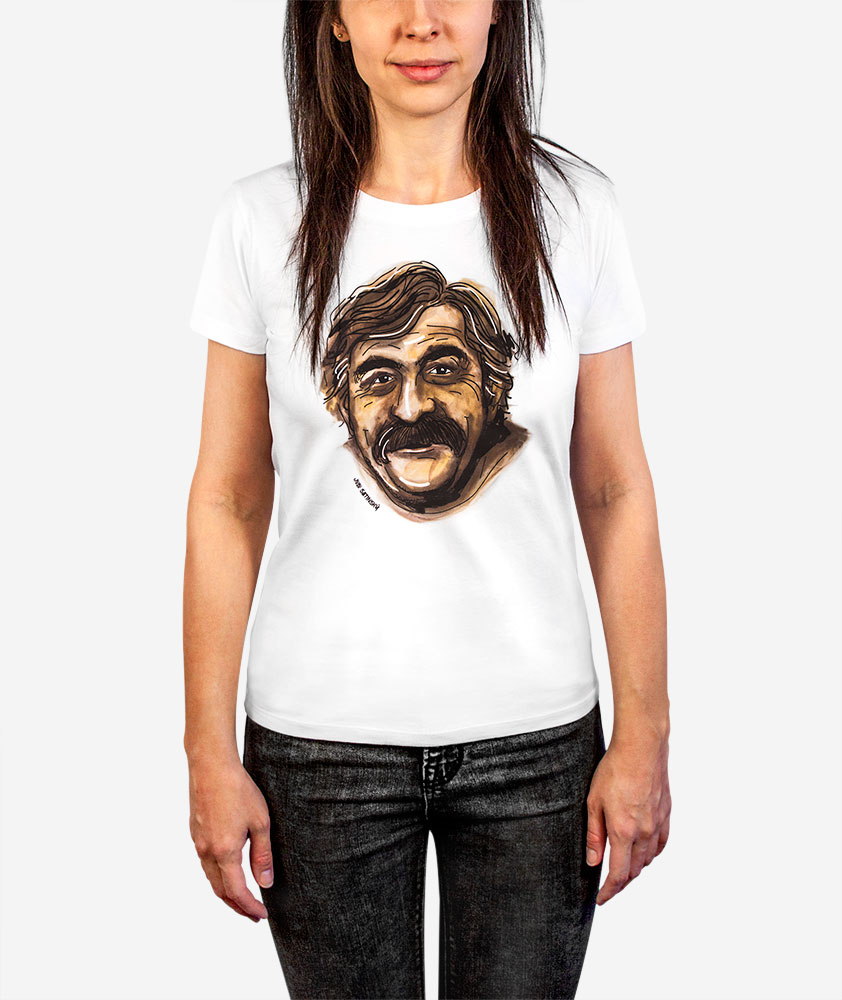 Dámske bavlnené tričko s portrétom Júliusa Satinského – významného slovenského herca, ktorý tvoril nerozlúčiteľné duo s Milanom Lasicom. Objavil sa vo filmoch ako „S tebou mě baví svět“ či „Srdečný pozdrav ze zeměkoule“. S Lasicom účinkovali v kabaretnom programe „Ktosi je za dverami“, Július Satinský taktiež písal detské knižky známe ako „Rozprávky uja Klobásy.“ Pôvodný portrét vznikol ručnou maľbou akvarelovými farbami, grafiku následne tlačíme na látku. Tričko dodávame v darčekovej ručne maľovanej krabičke.