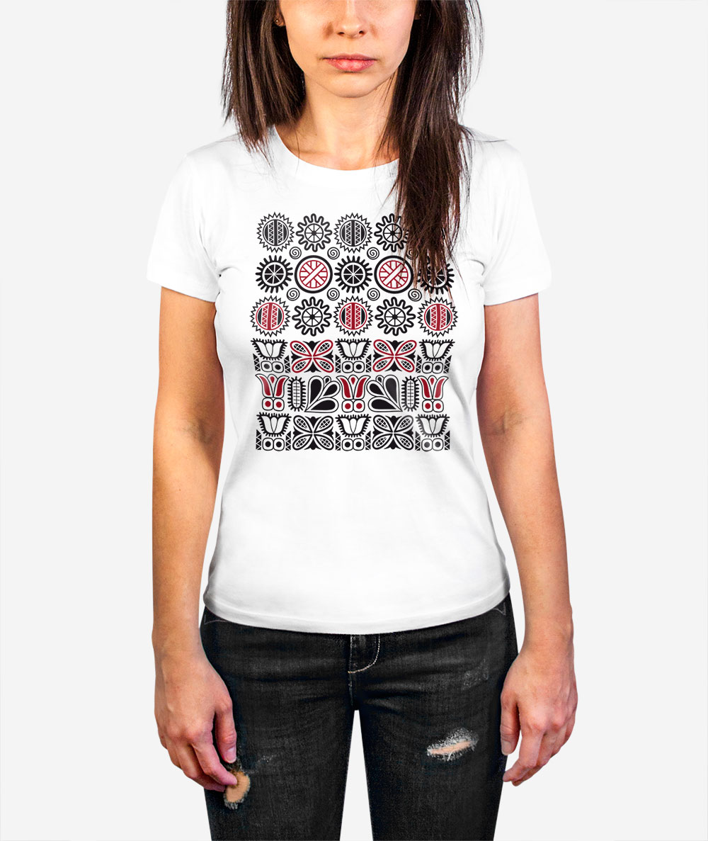 Na dámske biele tričko s folklórnym motívom Na tej Detve sme použili ornamentiku s pôvodom zo stredného Slovenska, priamo z mesta Detva. Detvianske tradičné geometrické a florálne vzory sme usporiadali do nových polôh a obohoťali ich o drobné nové prvky, čím sme umožnili vznik nových originálnych motívov Detvianskej kolekcie. Čierno-červená ornamentika Na tej Detve svojím názvom odkazuje na tradičnú ľudovú pieseň o murovanej studničke, vzor prinášame na tričkách i vakoch v rôznych farebných prevedeniach. Tričká posielame v darčekových ručne maľovaných krabičkách.