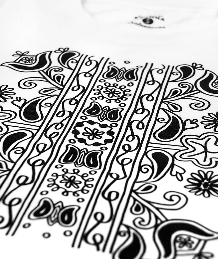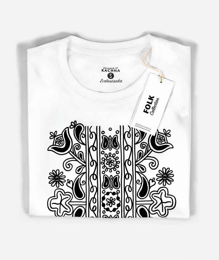 Dámske tričko s folklórnym motívom zobrazujúcim tradičný ľudový ornament s lúčnou flórou a motýľmi. Použitím sýtej čiernej farebnosti ľudový vzor výrazne kontrastuje so svetlým podkladom z organickej bavlny. Jednoduchá, pôvodne ručne kreslená ornamentika, má pôvod na strednom Slovensku, konkrétne v jednom z našich najstarších miest – v meste Zvolen. Pozri aj ostatné vecičky zo Zvolenskej kolekcie.