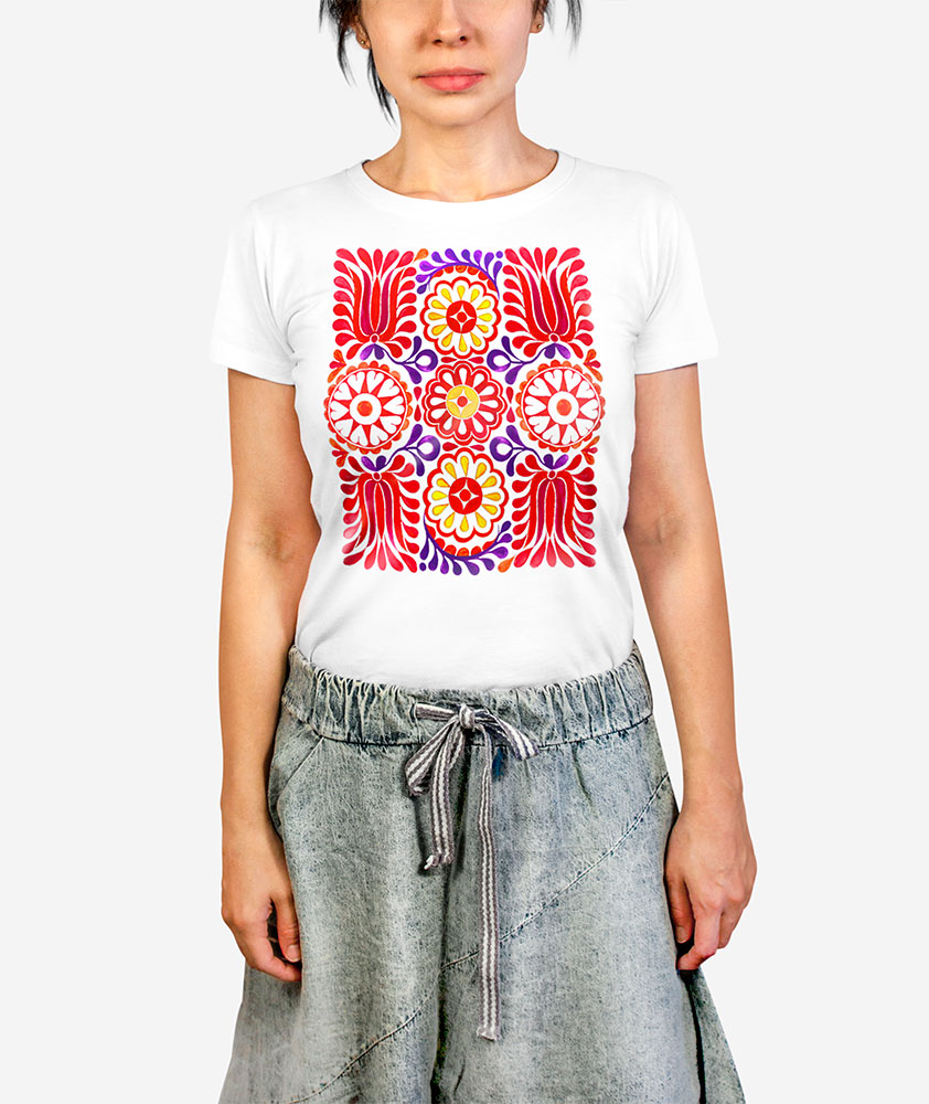 Folklórny motív V záhrade tulipánov zobrazuje tradičný ornament, ktorý upúta svojou sviežou letnou farebnosťou. Pôvodná maľba vznikala ručnou prácou s akvarelom, ktorý vďaka svojmu rýchlemu schnutiu, zanecháva charakteristickú textúru viditeľných ťahov štetcom.
