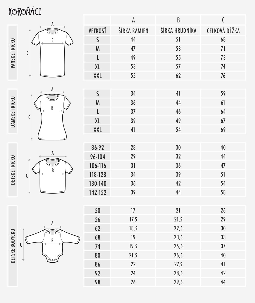 Tričká s krátkym rukávom a bodyčká s dlhým rukávom sú vyrobené zo 100% bavlny vysokej gramáže 190g/m² s kvalitnou dlhotrvajúcou potlačou. Ideálne pranie do 30°, ale bez problémov znesú aj vyššie teploty. Každého Koroňáka posielame v darčekovej krabičke.