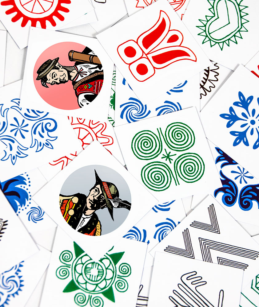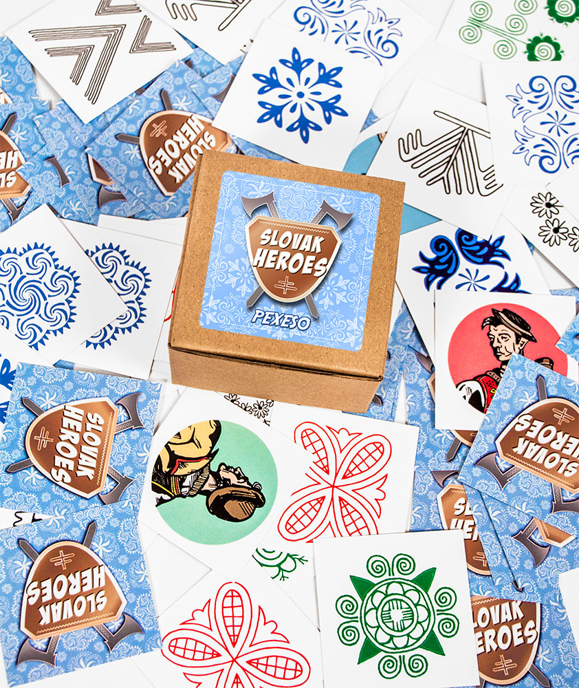 Pexeso Slovak Heroes pozostáva zo 72 hracích kartičiek, z toho 32 párov zobrazuje ľudové ornamenty, ktoré reprezentujú štyri kraje Slovenska. V prípade Západu (modrá) sa jedná o tradičné ľudové ornamenty z Jablonice. Stredné Slovensko (Červená) reprezentujú tradičné detvianske ornamenty. Východ (zelená) dostal výzdobu pôvodom z obce Torysky a Severné Slovensko (čierna) zastupuje ornamentálna výzdoba z oravskej obce Veličná. Ornamentálne kartičky dopĺňa štvorica párov portrétov Strážcov Slovenska.
