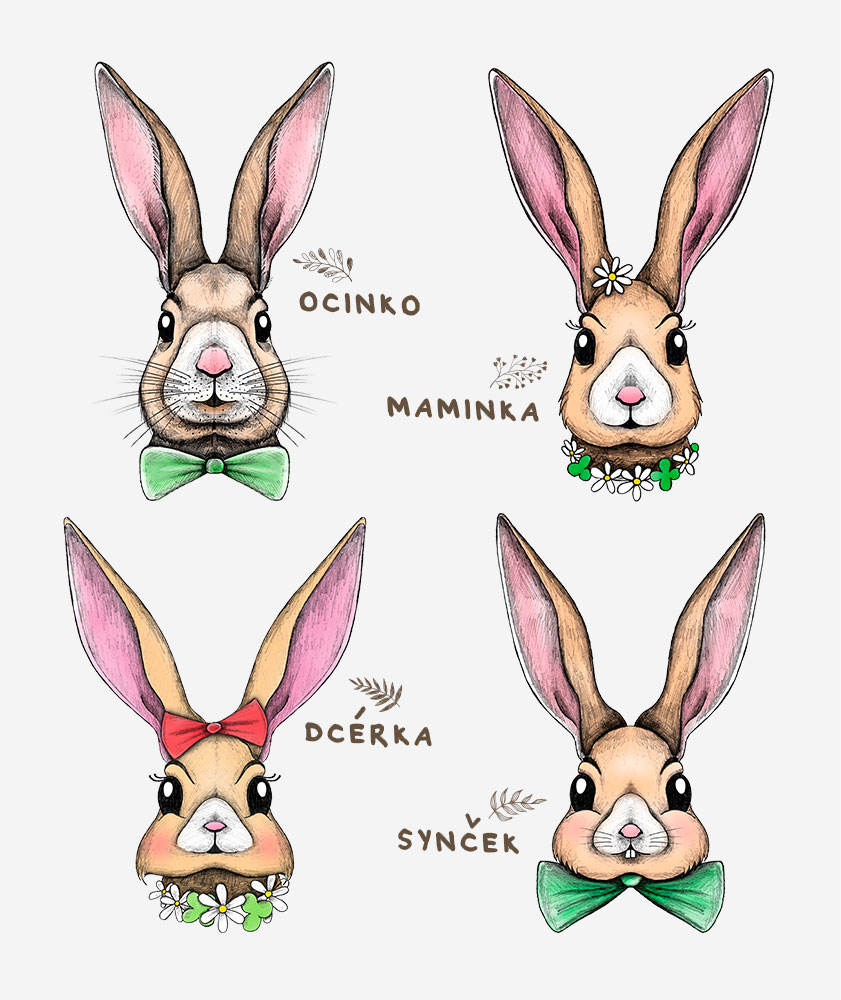 Kolekcia veľkonočného oblečenia s členmi rodinky Zajacových. Kolekciu je možné vyskladať z ľubovoľného množstva tričiek s ľubovoľnými členmi zajačej rodinky. V ponuke sú pánske, dámske i detské tričká a taktiež detské bodyčká pre tých najmenších zajačikov.