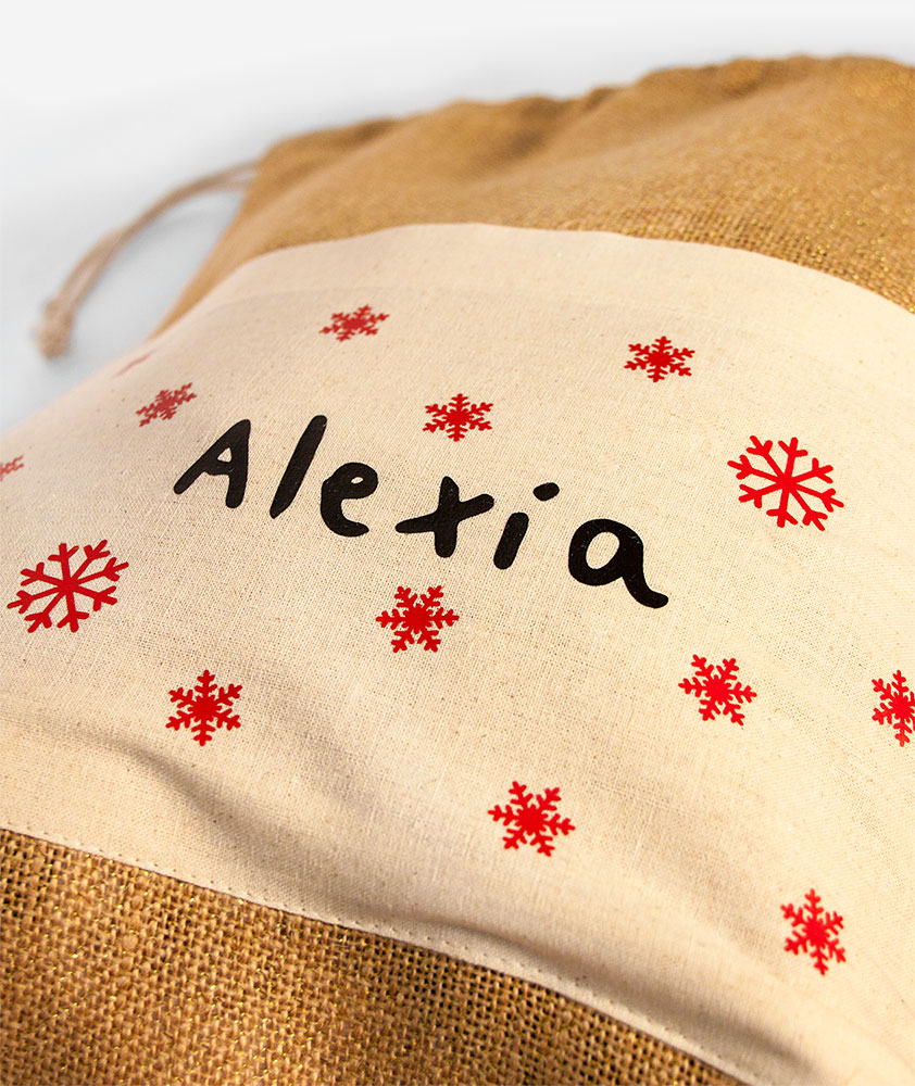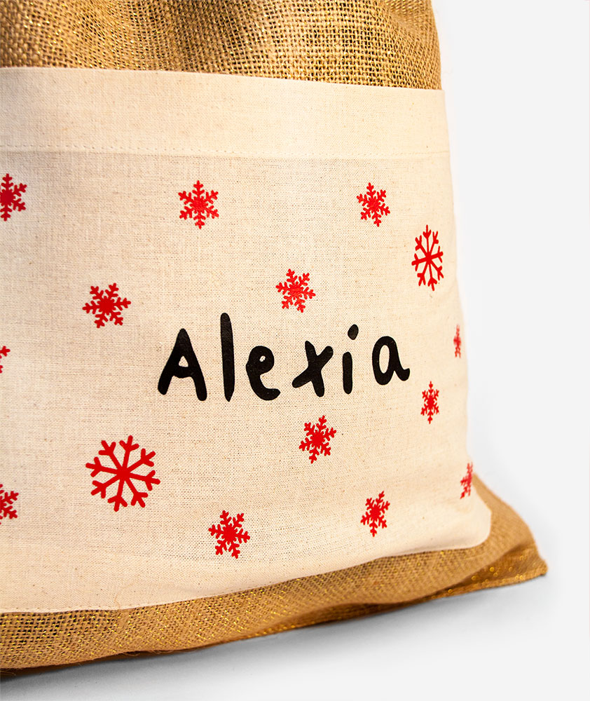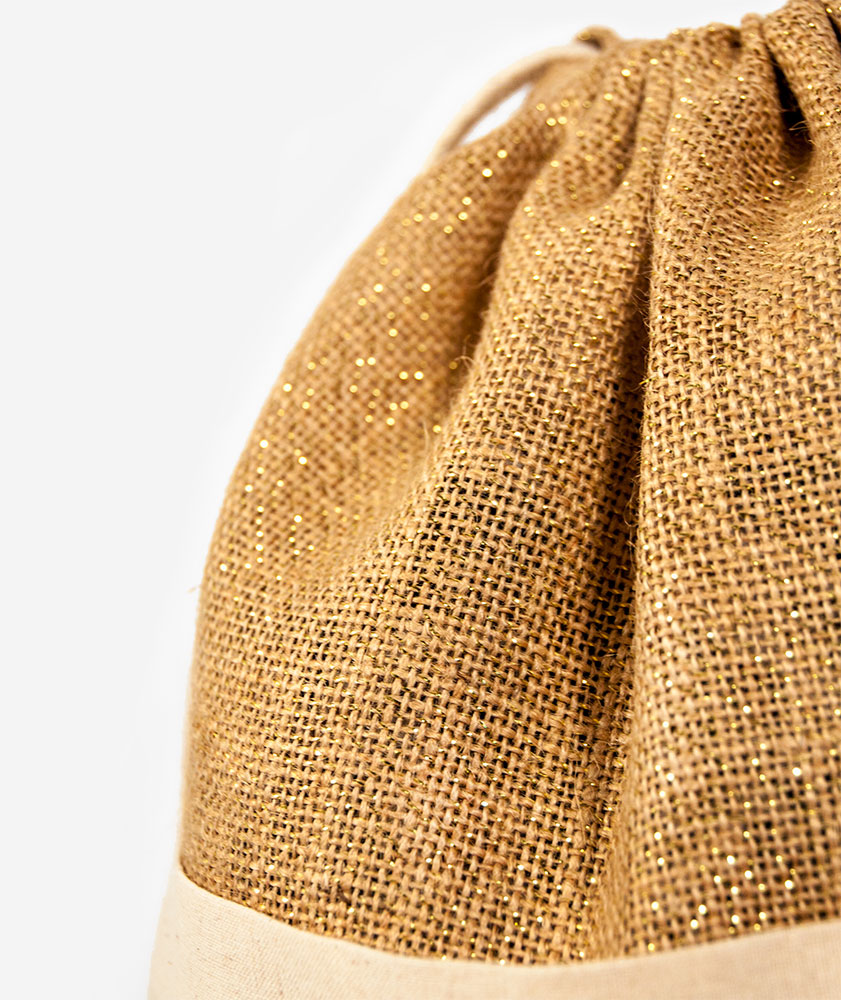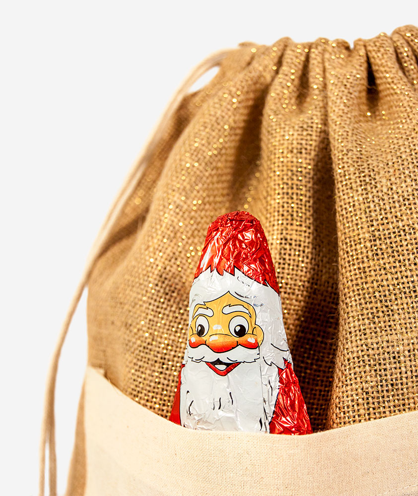 Jutové vrecúško pretkané zlatou niťou, vďaka ktorej sa celé krásne trblieta. Podaruj všemožné mikulášske dobroty v prírodnom vrecúšku, na ktorom si každý obdarovaný nájde svoje meno. Jutové vrecúško dopĺňa bavlnené predné vrecko, kam môžeš schovať obálku s listom od/pre Mikuláša alebo jeho čokoládovú zmenšeninu.