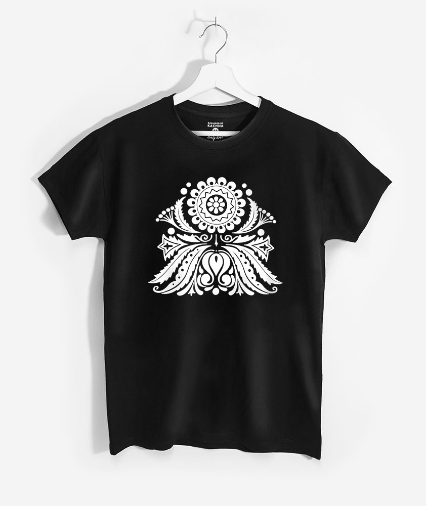 Pánske čierne s folklórnym motívom florálnej tematiky v čistej bielej podobe na kontrastnej čiernej látke. Použitý ornament sa používal na celom západnom Slovensku. Základ použitej ornamentiky je totožný s ľudovým motívom Makovička, preto oba nájdeš v rovnakej kolekcii. Tričká posielame v darčekových ručne maľovaných krabičkách.