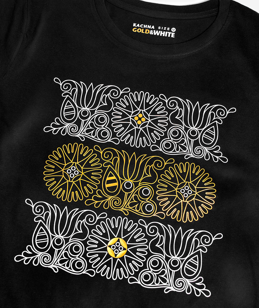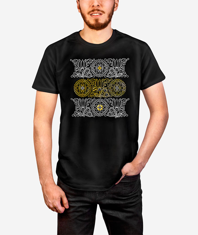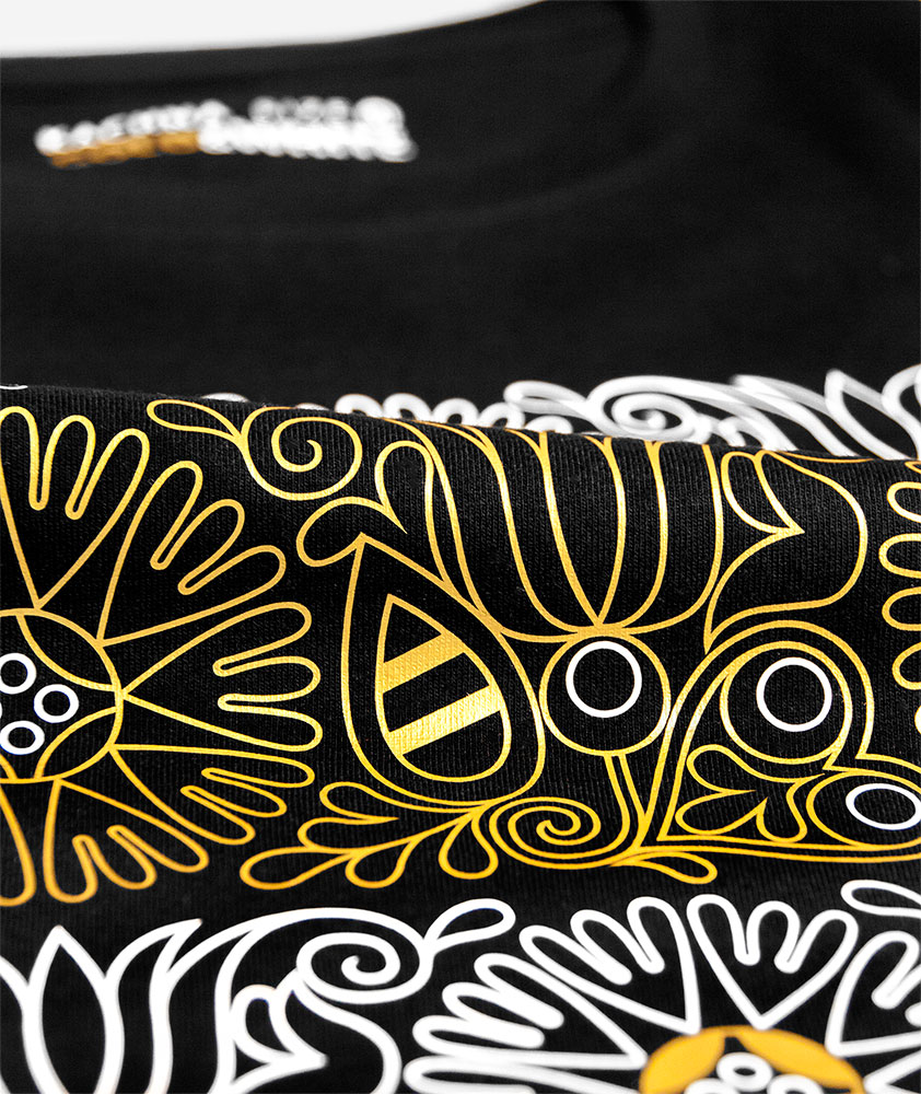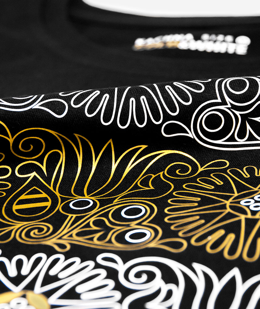 Našim cieľom bolo vytvoriť limitovanú elegantnú mestskú kolekciu tričiek a vakov, preto sme pod zlato-biely dizajn použili čiernu látku, vďaka čomu potlač čo najlepšie vynikla. Tradičnej ľudovej ornamentike sme sa snažili dať novú modernú podobu.