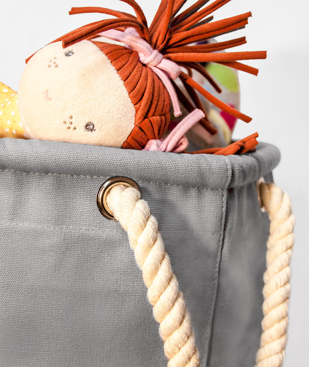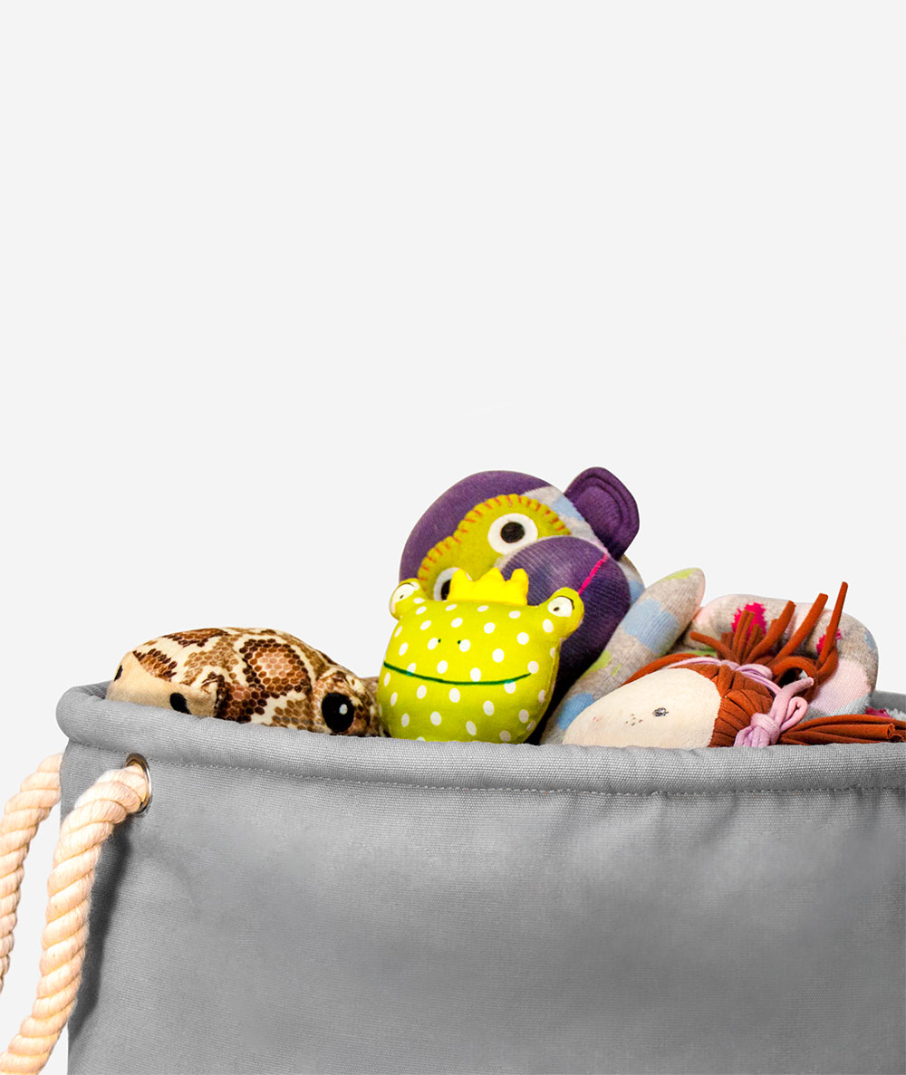 Bavlnený obrovský kôš určený na rýchle a praktické uskladnenie množstva detských hračiek alebo iných predmetov povaľujúcich sa po detskej izbičke. Možné taktiež využívať ako kôš na špinavú bielizeň. Kôš je vyrobený z extra hrubej látky a je prenosný vďaka hrubým prepletaným úchytným lanám. Kôš je vysoký 60 cm s kruhovým spodkom s priemerom 40 cm a kapacitou 75 litrov. Kôš nedrží tvar pokiaľ nie je naplnený, vďaka čomu sa dá ľahko zrolovať a uskladniť. Súčasťou je bavlnená taška s leňochodom na uskladnenie.