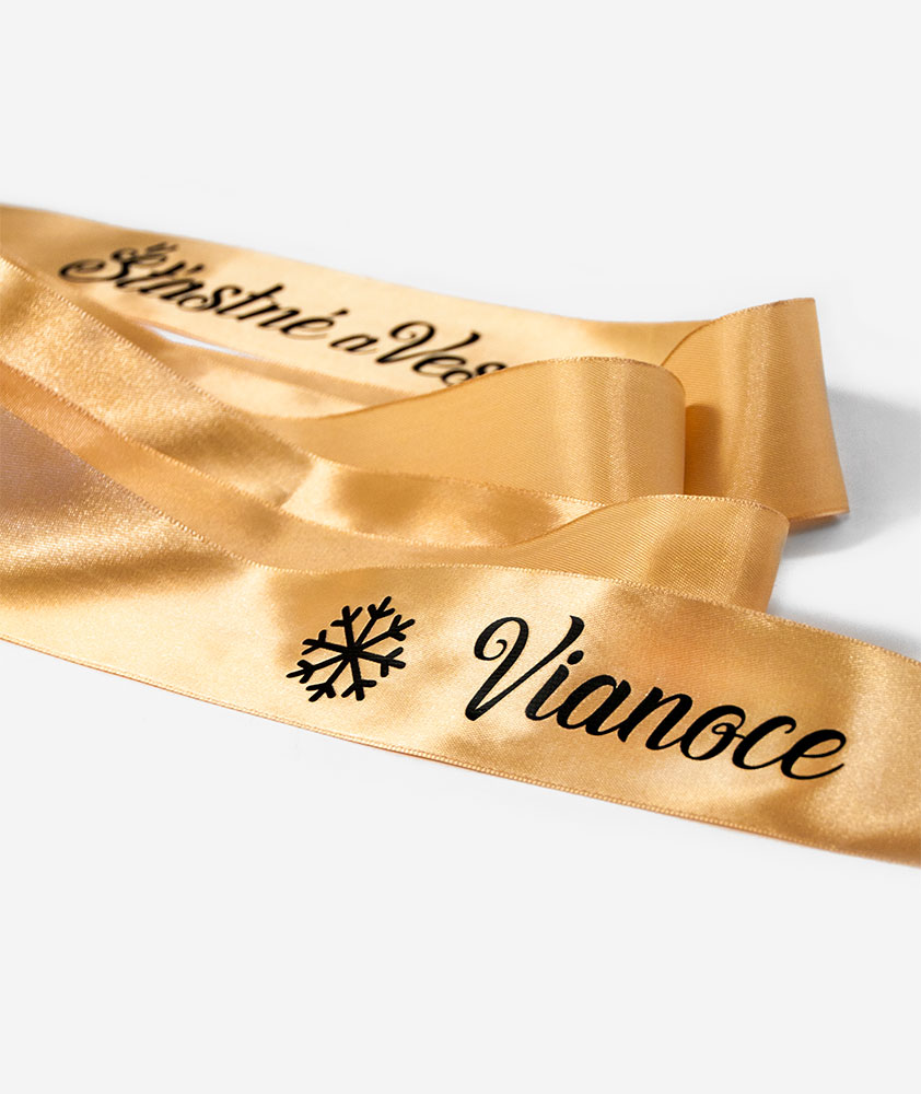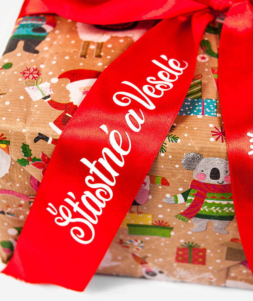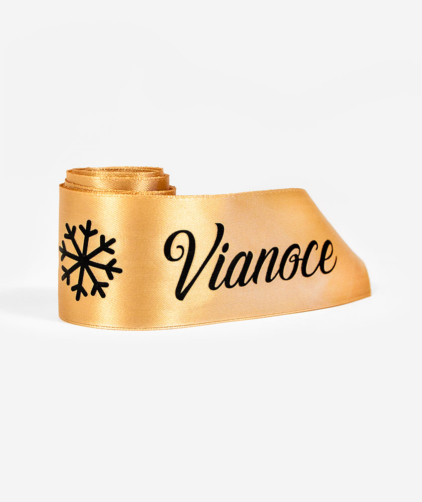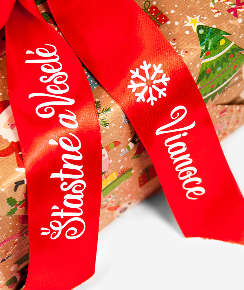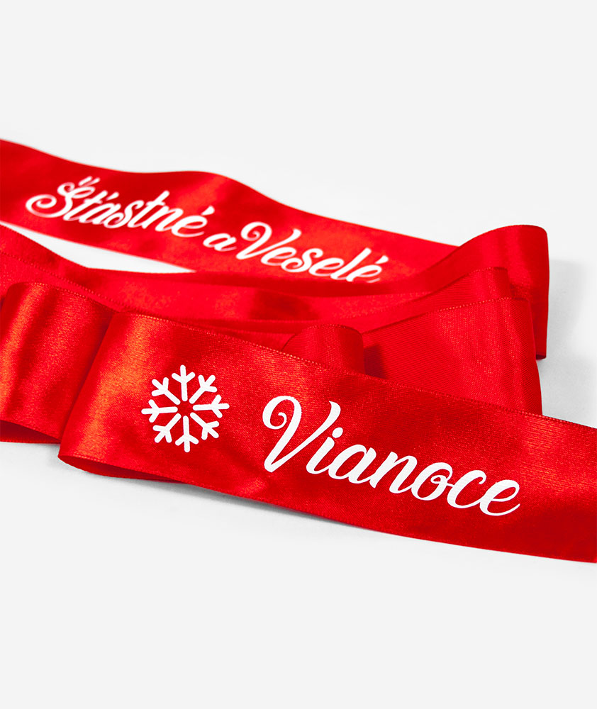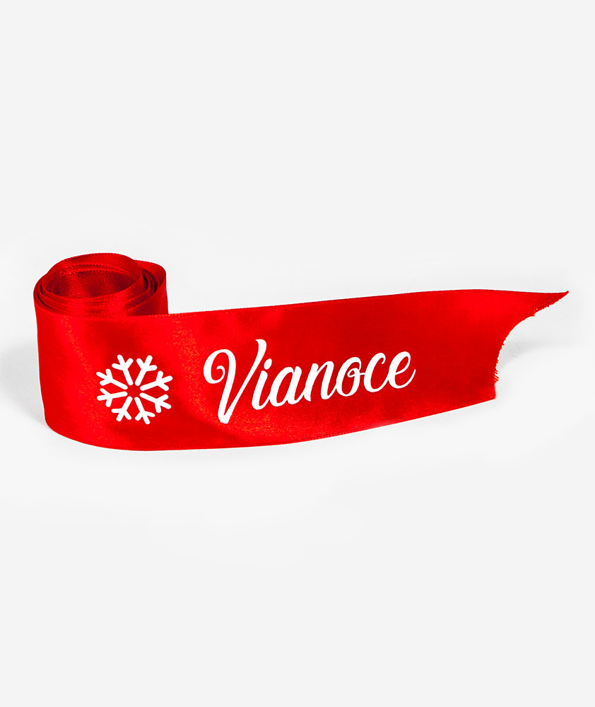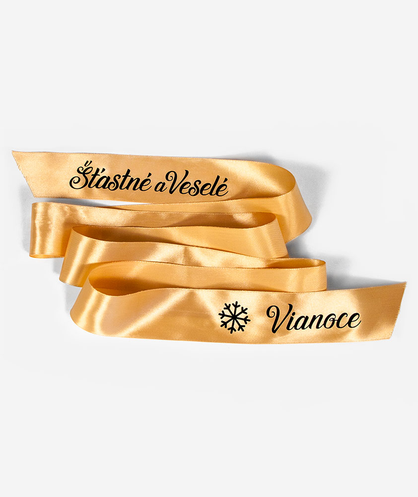 Vianočná saténová stuha dostupná v dvoch farebných variantoch. Ideálna na dozdobenie vianočných darčekov alebo ako dekorácia na vianočný veniec, obrus či svietnik. Stuha je široká 5 cm a je dostupná v červenej farbe s bielym nápisom alebo v zlatej farbe s čiernym nápisom Šťastné a veselé Vianoce. Nápis je rozdelený tak, aby bol viditeľný pri zviazaní do mašle – polovička nápisu je umiestnená na jednom konci stuhy, zatiaľ čo druhá polovička na druhom.