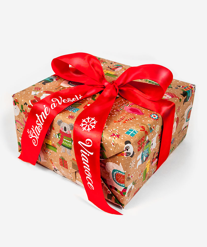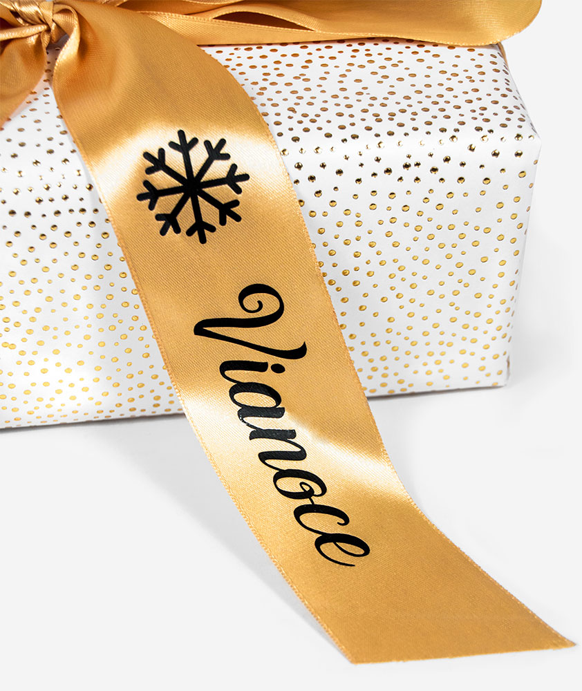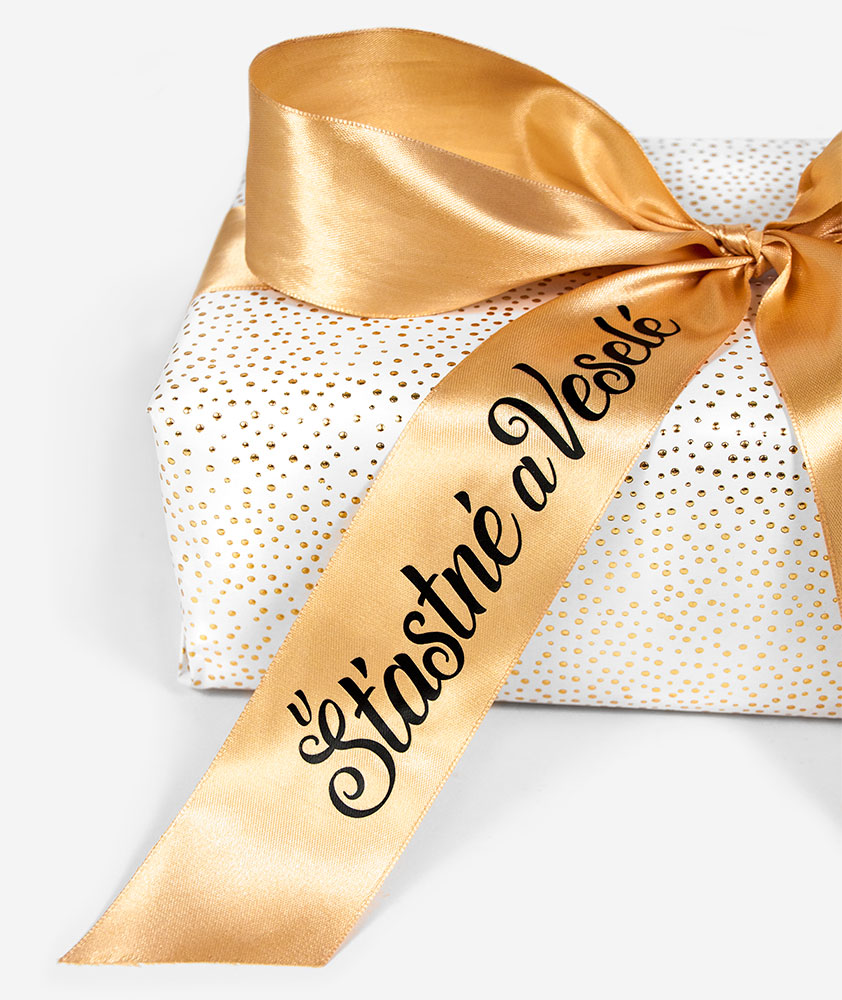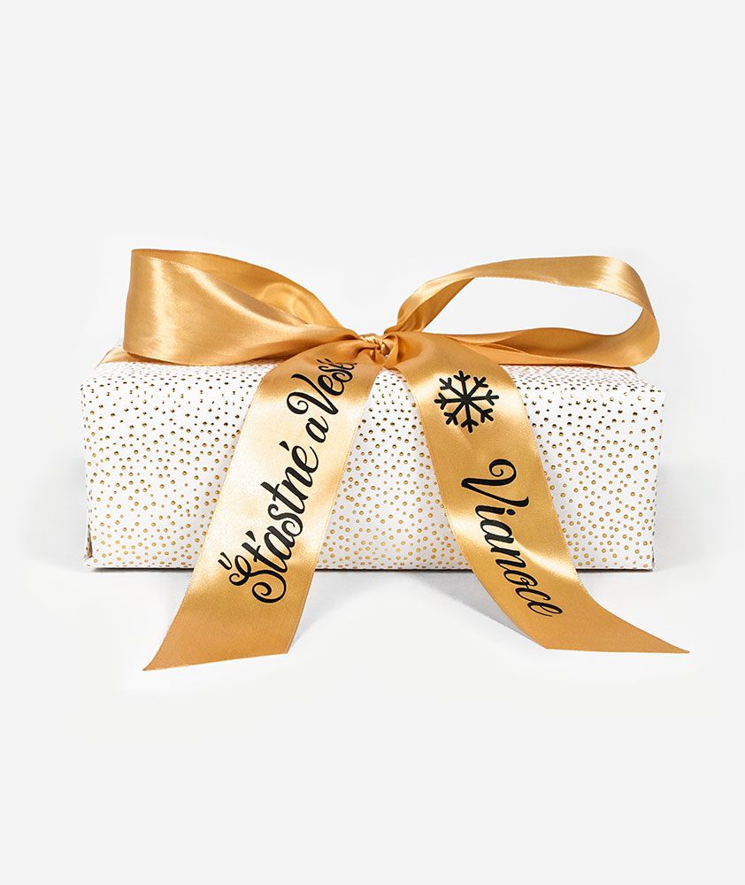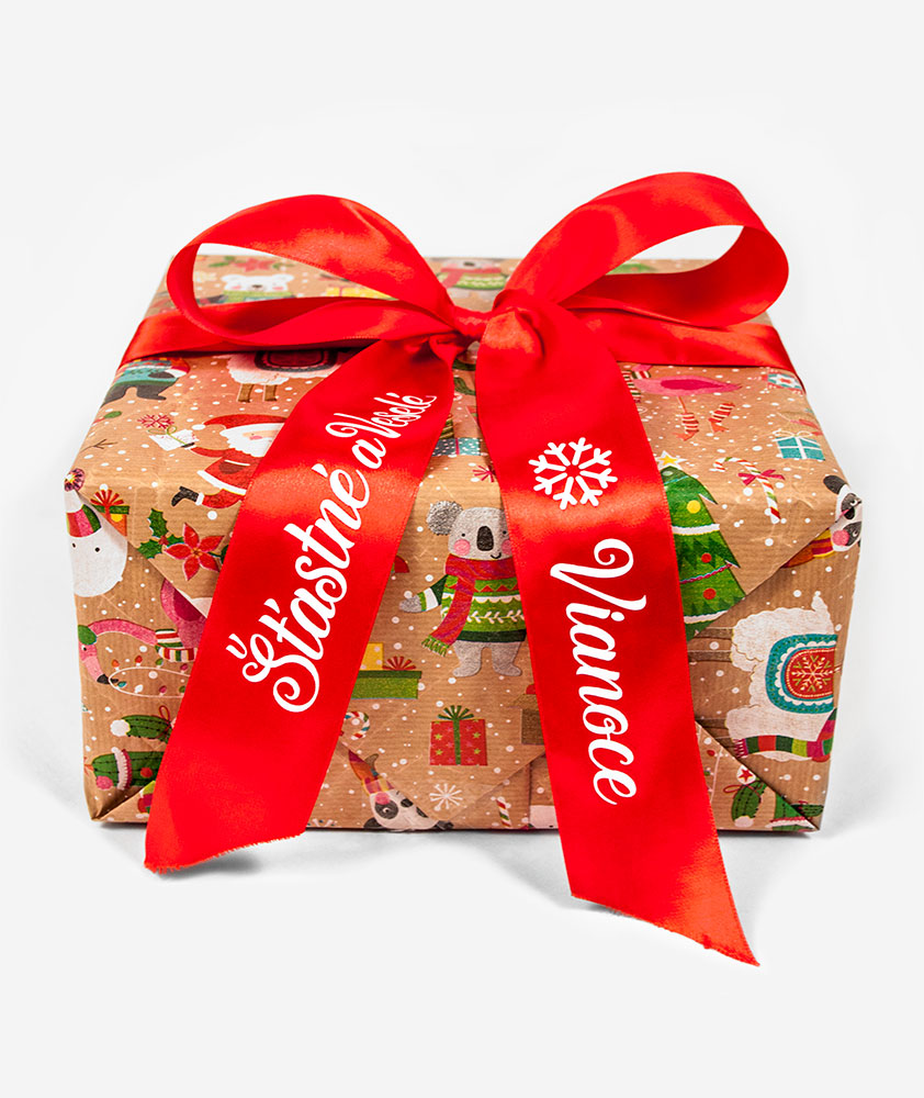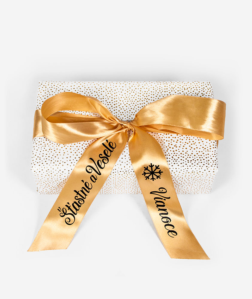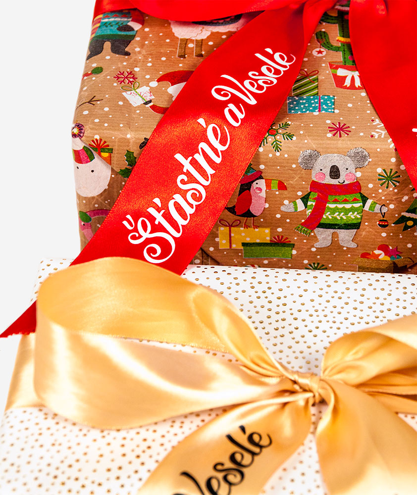 Vianočná saténová stuha dostupná v dvoch farebných variantoch. Ideálna na dozdobenie vianočných darčekov alebo ako dekorácia na vianočný veniec, obrus či svietnik. Stuha je široká 5 cm a je dostupná v červenej farbe s bielym nápisom alebo v zlatej farbe s čiernym nápisom Šťastné a veselé Vianoce. Nápis je rozdelený tak, aby bol viditeľný pri zviazaní do mašle – polovička nápisu je umiestnená na jednom konci stuhy, zatiaľ čo druhá polovička na druhom.