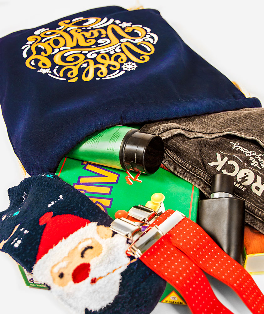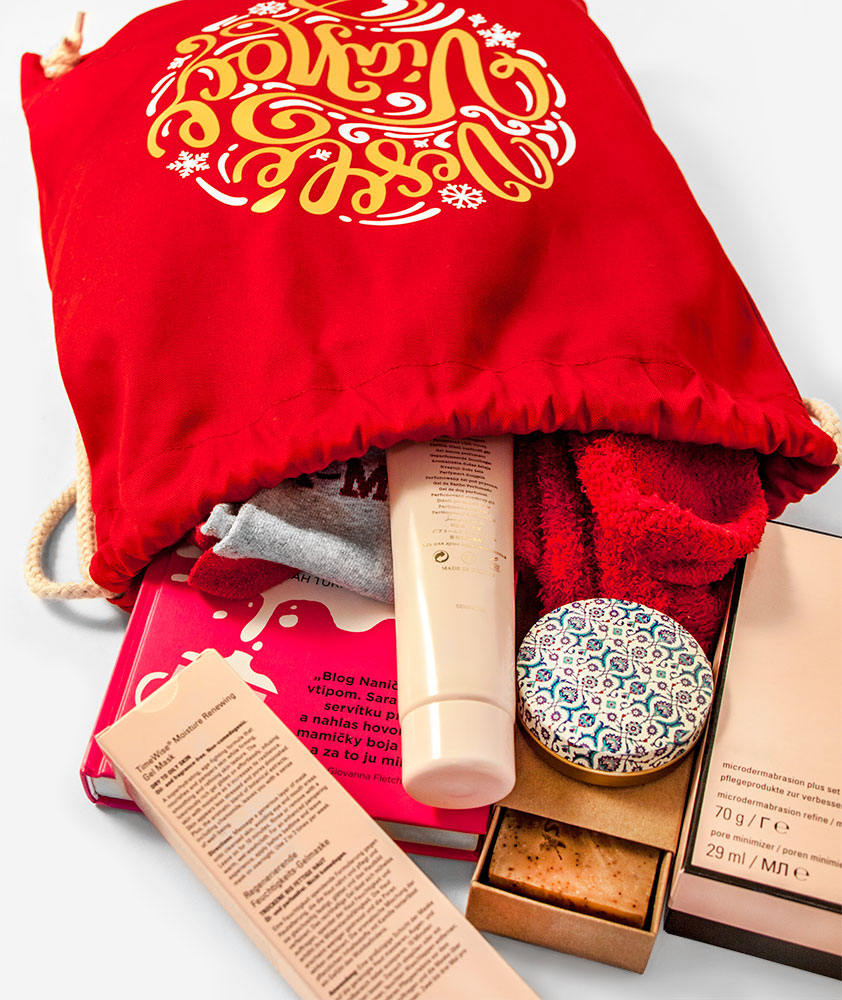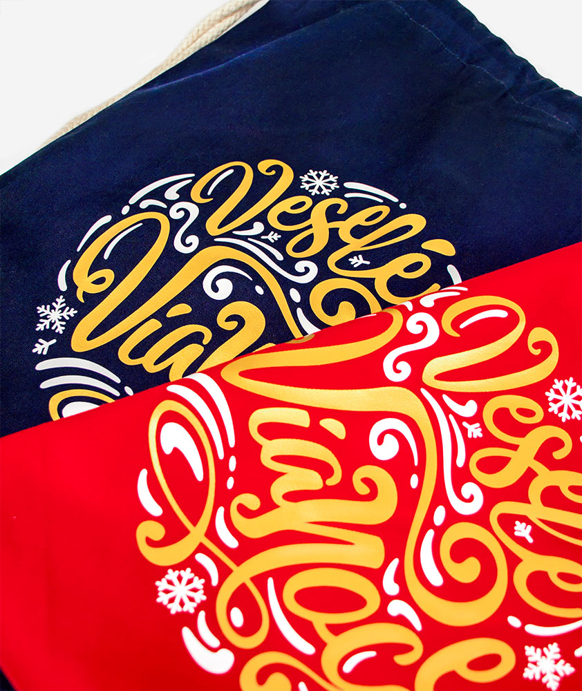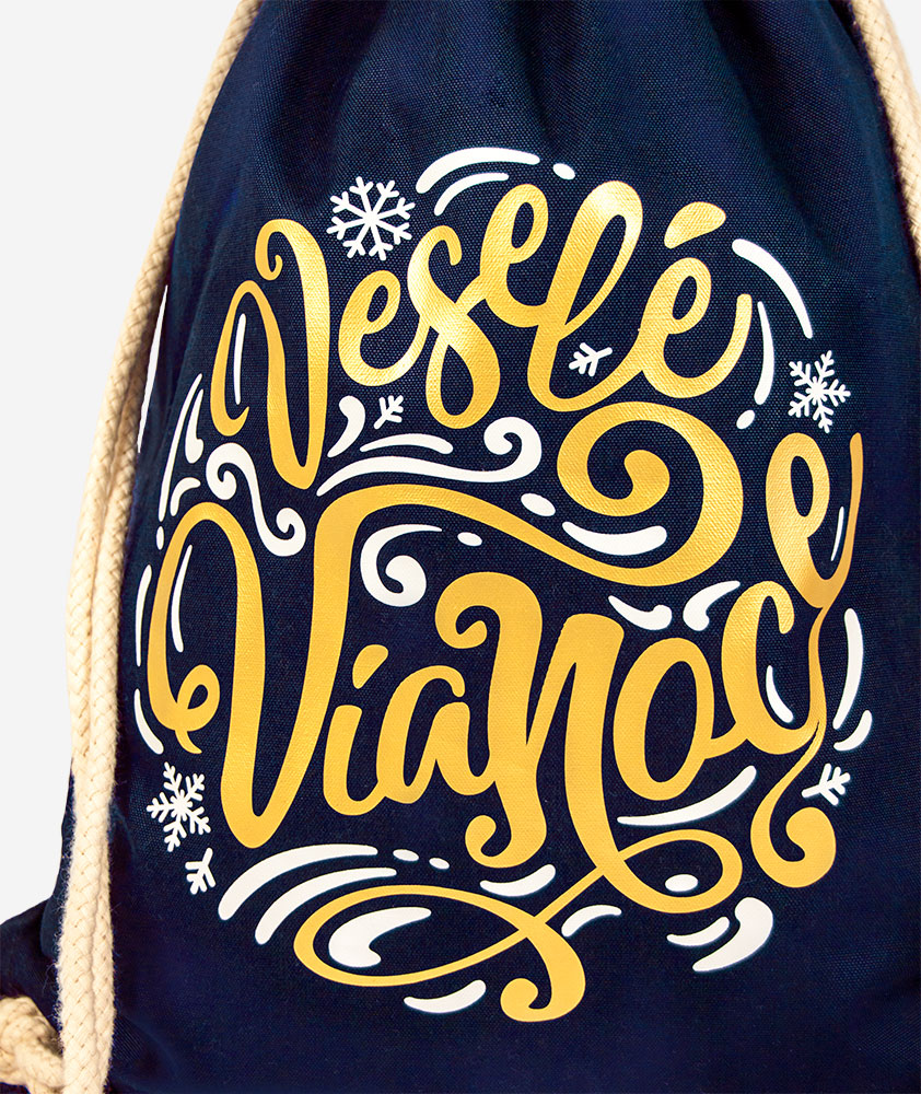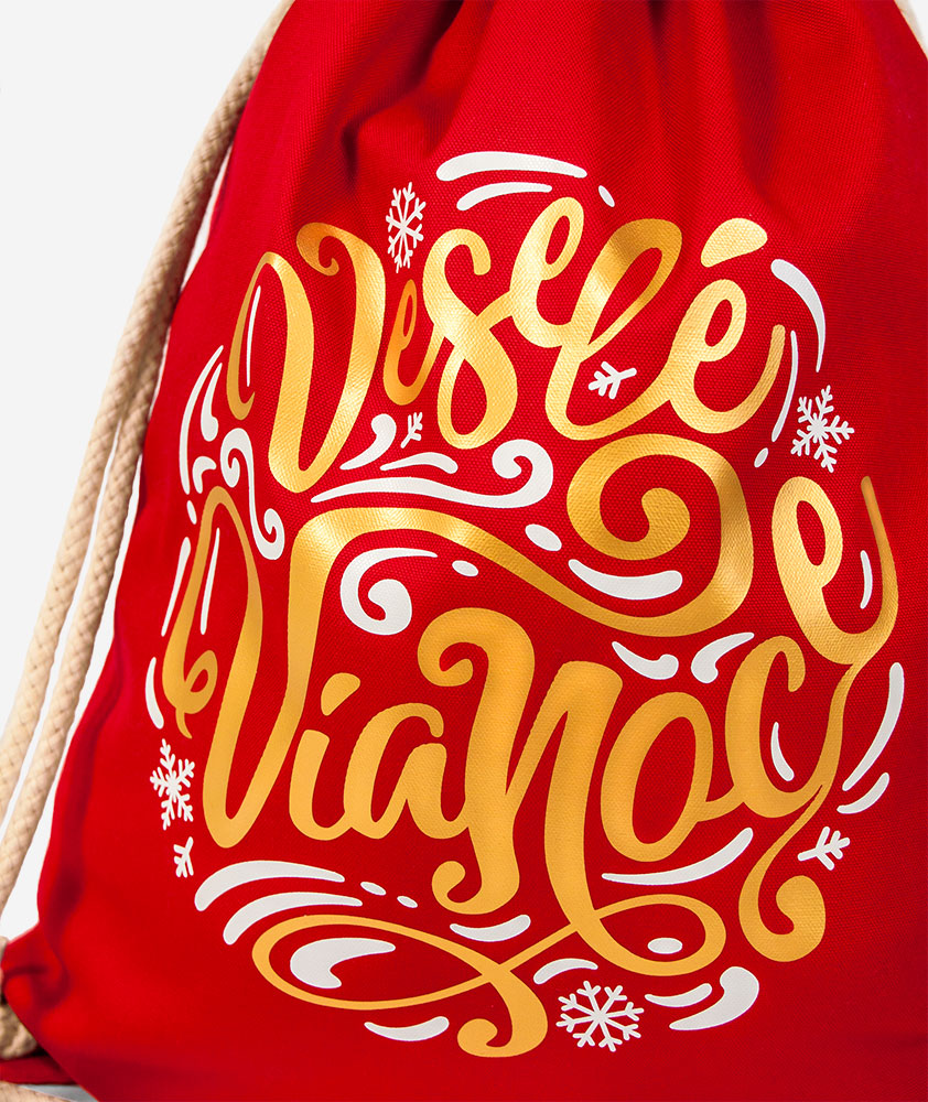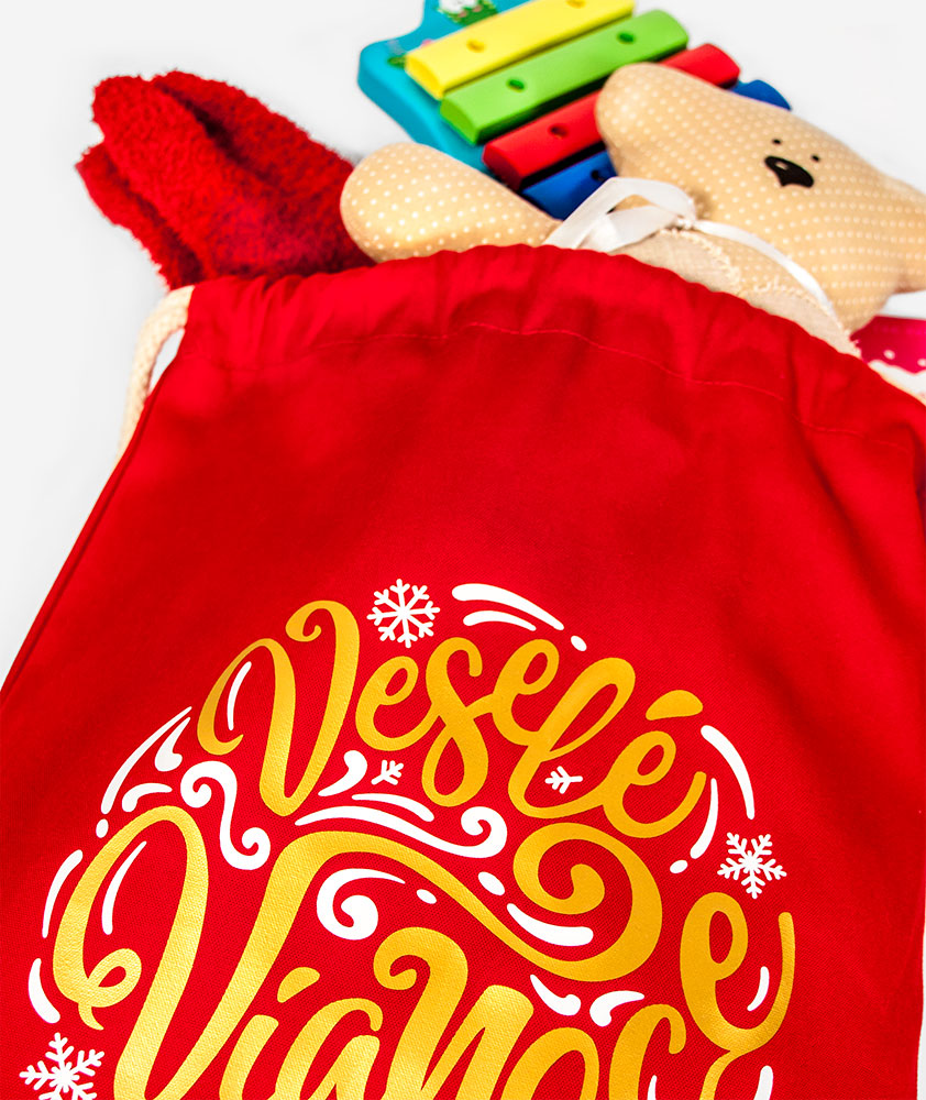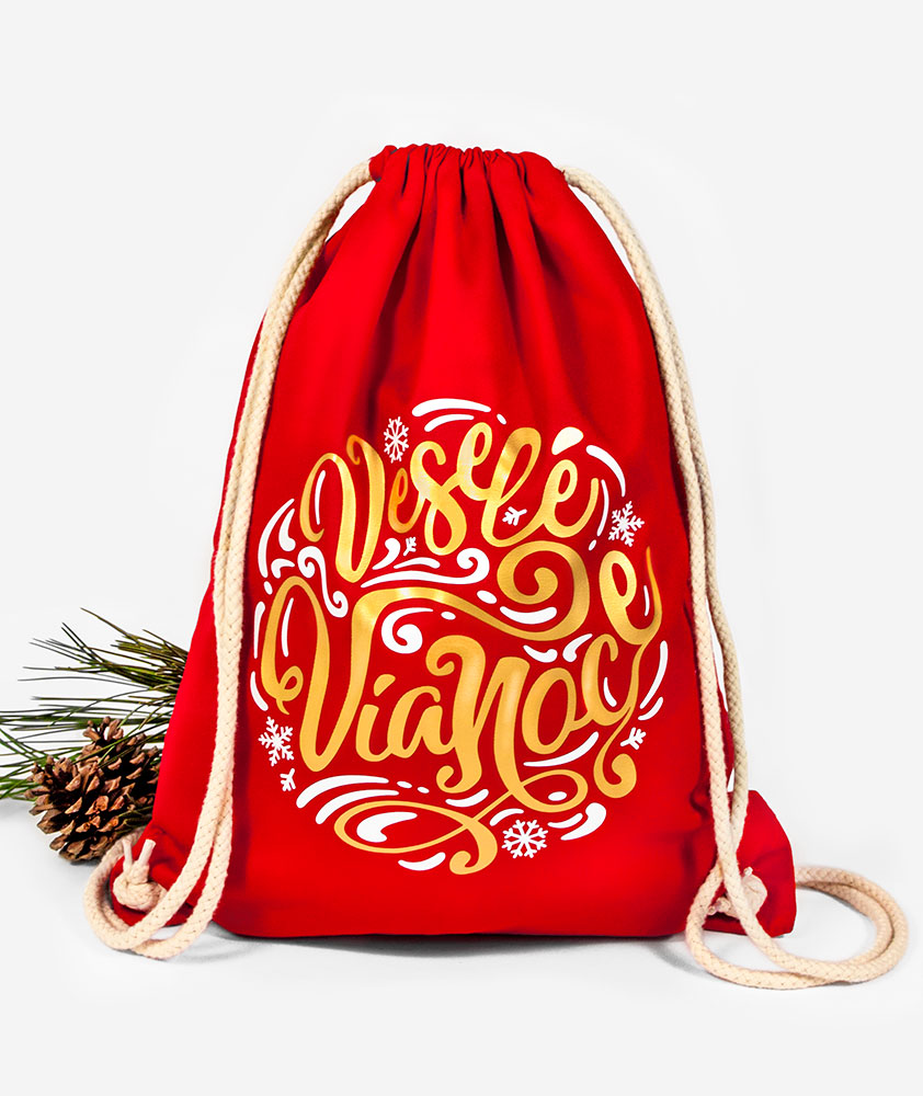 Bavlnený vianočný vak dostupný v dvoch farebných prevedeniach so zlatým nápisom Veselé Vianoce. Ideálny variant balenia darčekov pre tých, ktorí chcú ušetriť čas balením každého darčeka zvlášť do papiera, ktorý nakoniec aj tak skončí v koši. Zároveň skvelý spôsob darovania menších vianočných darčekov v podobe kozmetiky, ponožiek, oblečenia, šperkov, knižiek alebo hračiek spolu pokope v originálnom balení.